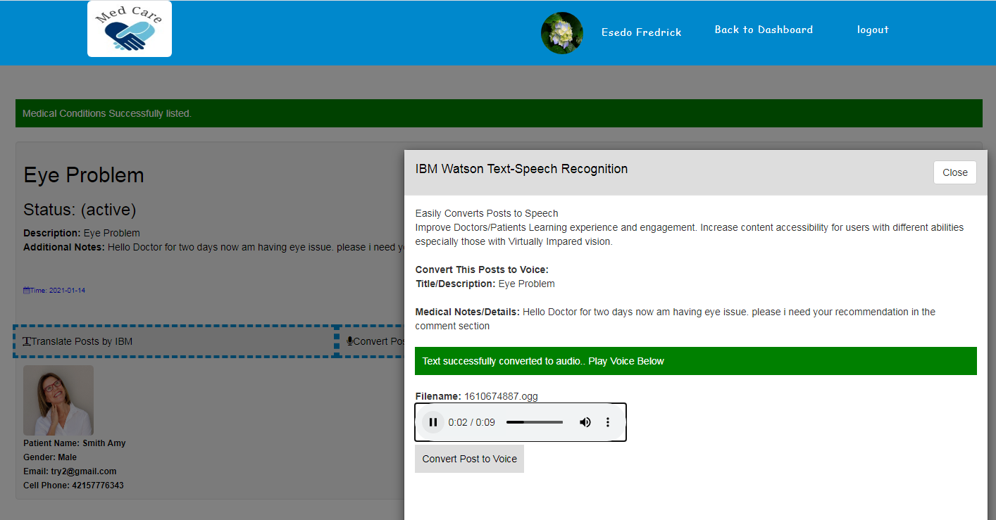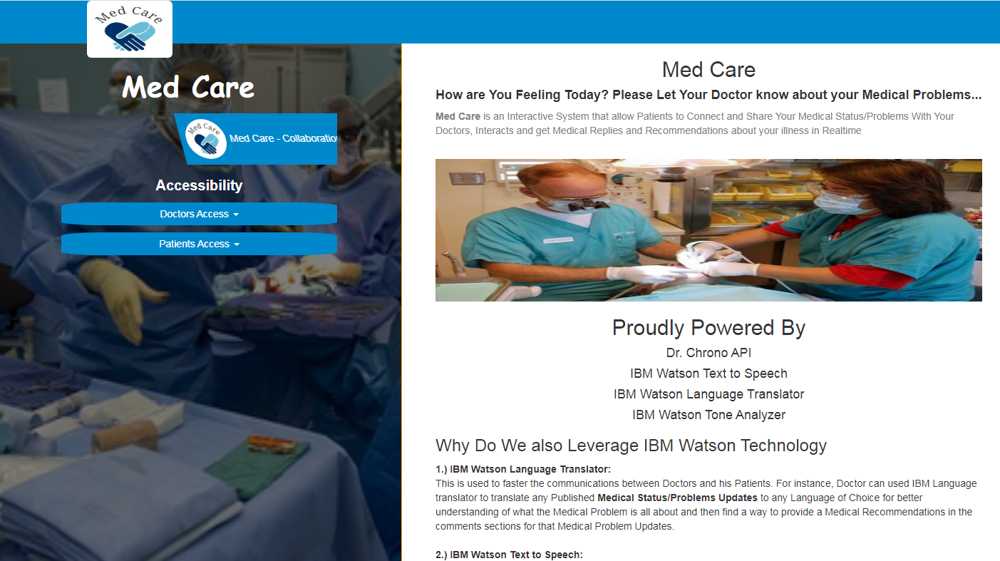 Med Care also uses various IBM Technologies along with Dr. Chrono API to assist Doctors in diagnosing and communicating to his patients