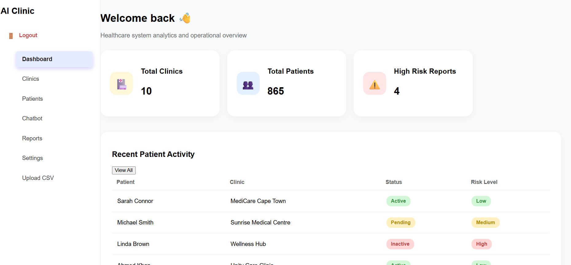 I wanted to build a single, unified platform that makes data-driven decisions possible for healthcare teams. The goal was to create a tool that is intuitive, responsive, and future-ready, integrating AI insights and predictive analytics to empower clinics to provide better care.