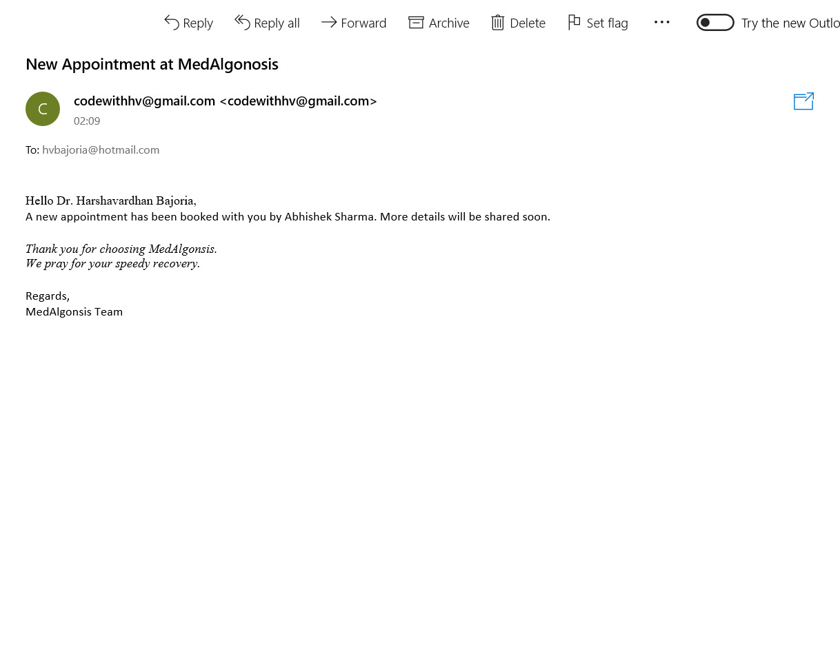 - Microsoft Azure Logic App to send emails to the patient, doctor on appointment booking.