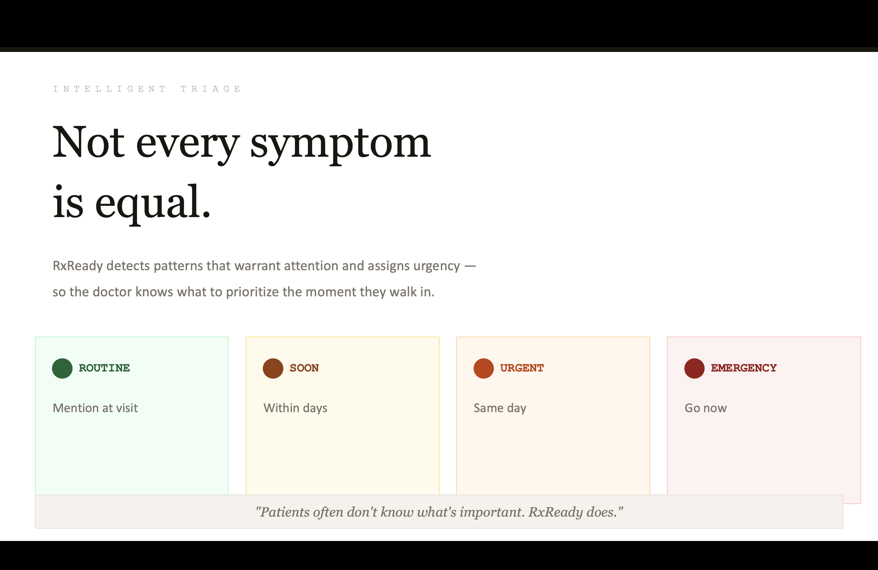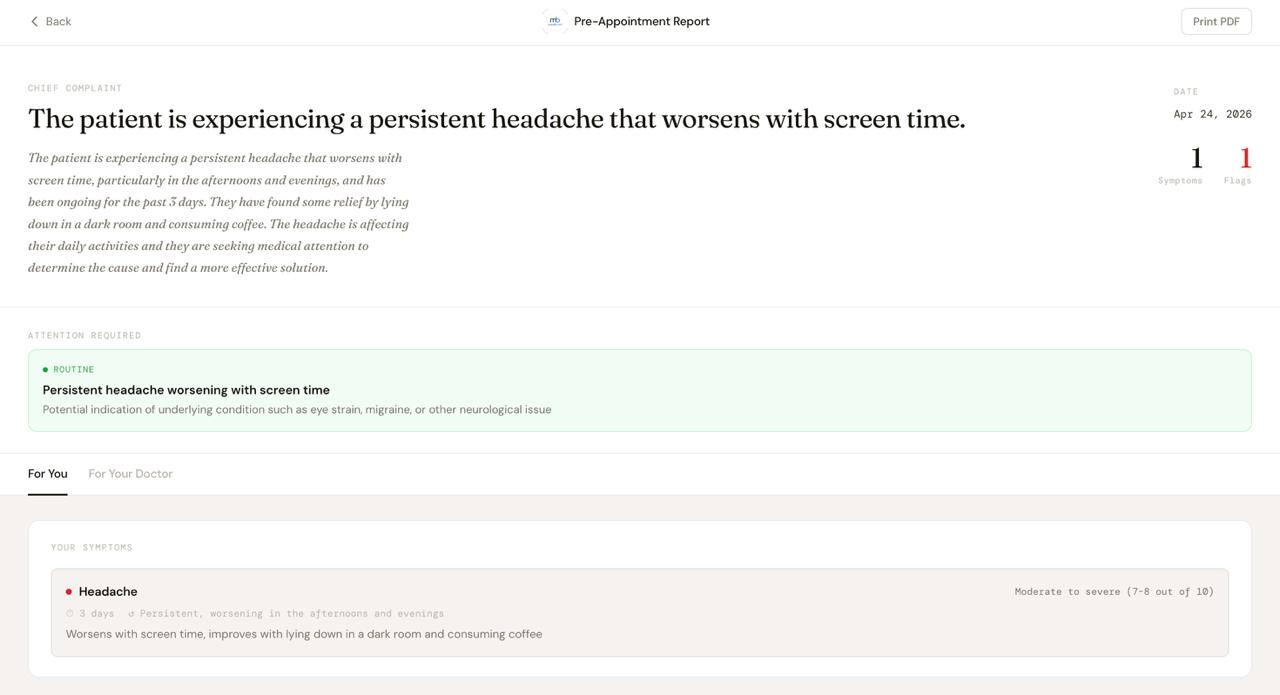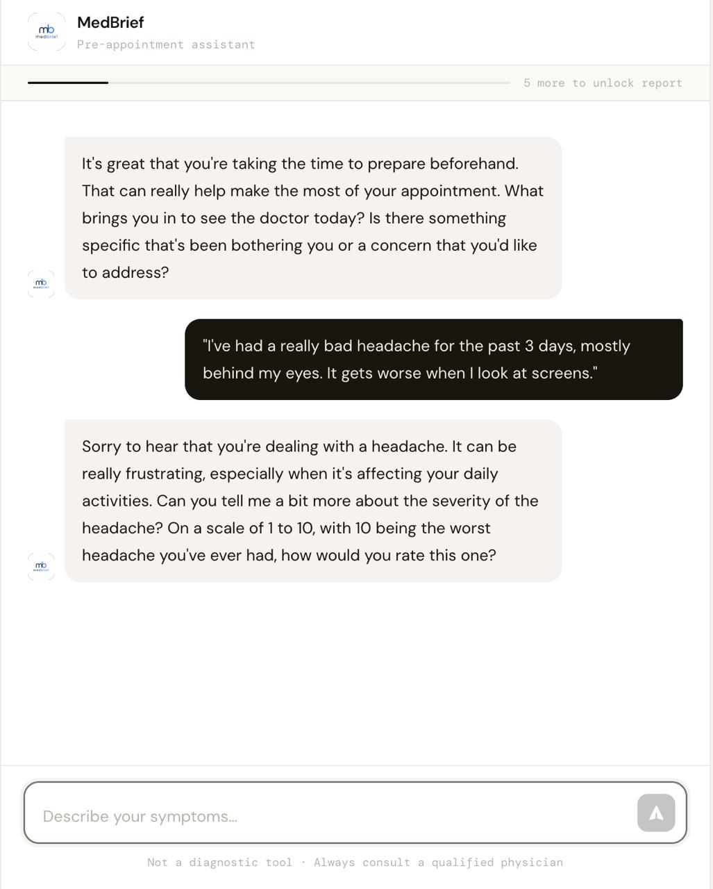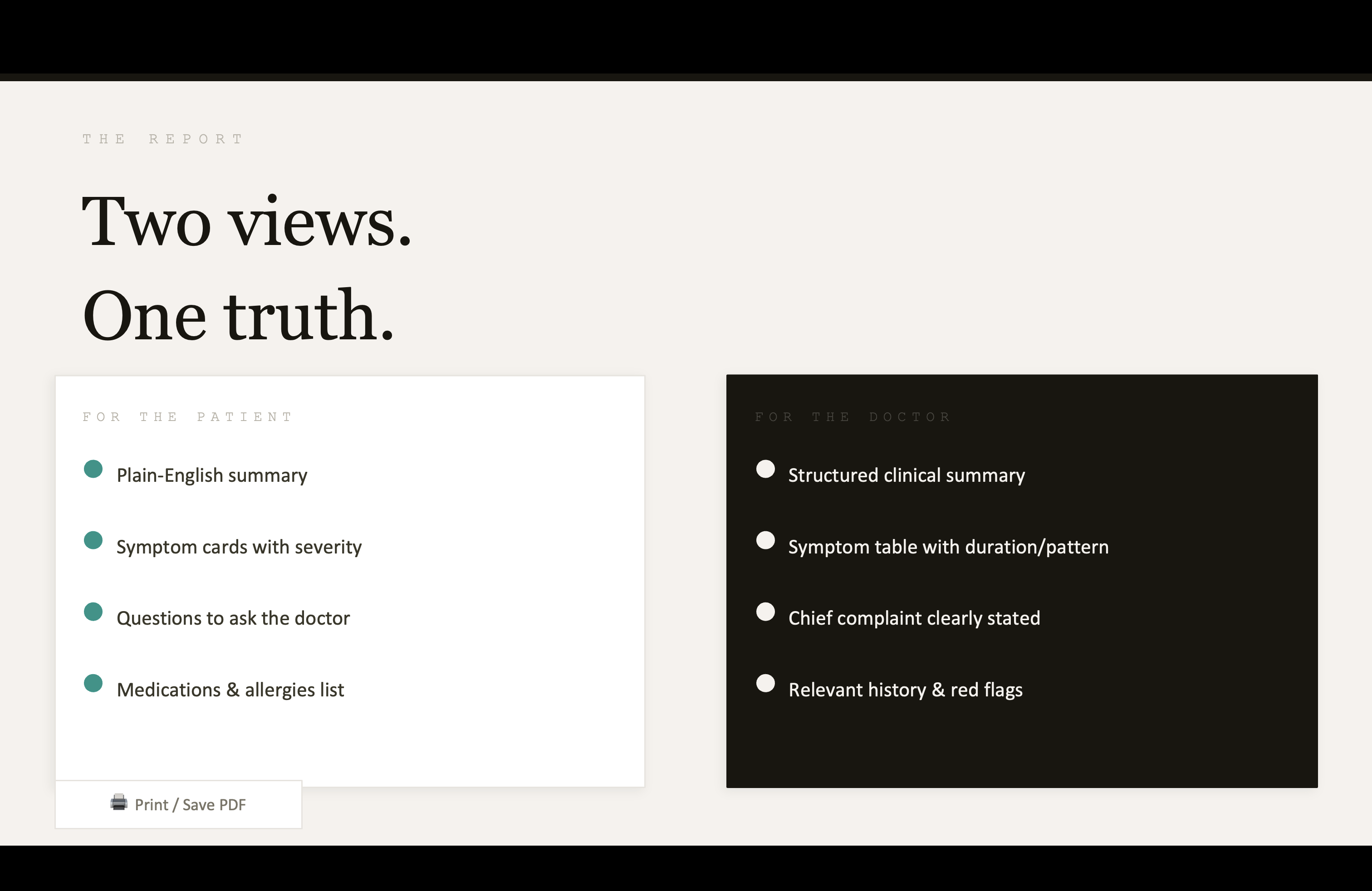 Healthcare breaks down at communication. Patients forget symptoms, struggle to explain issues, and waste most of their ~18-minute visit figuring out what to say. We asked: what if patients could walk in as prepared as doctors?