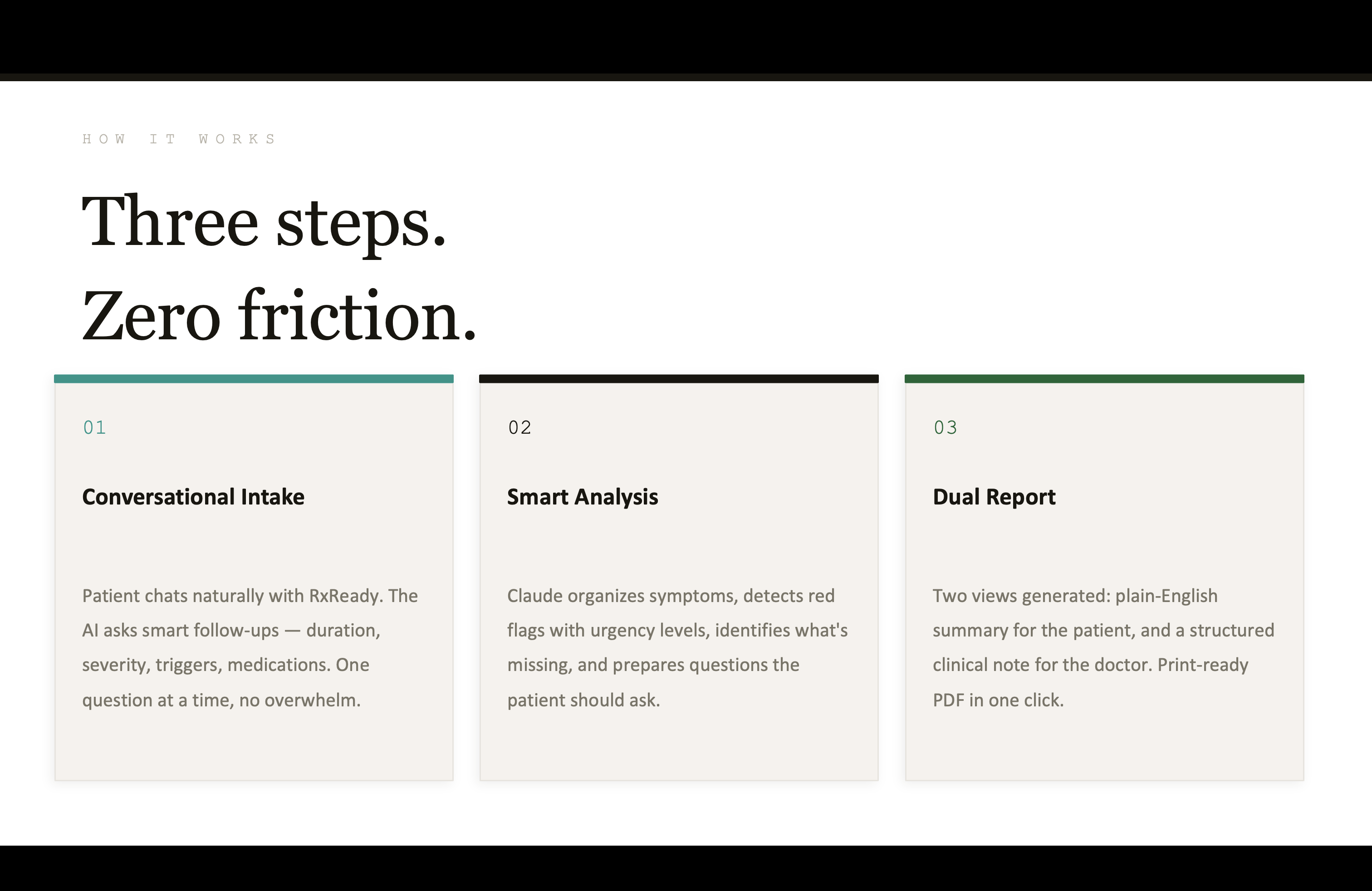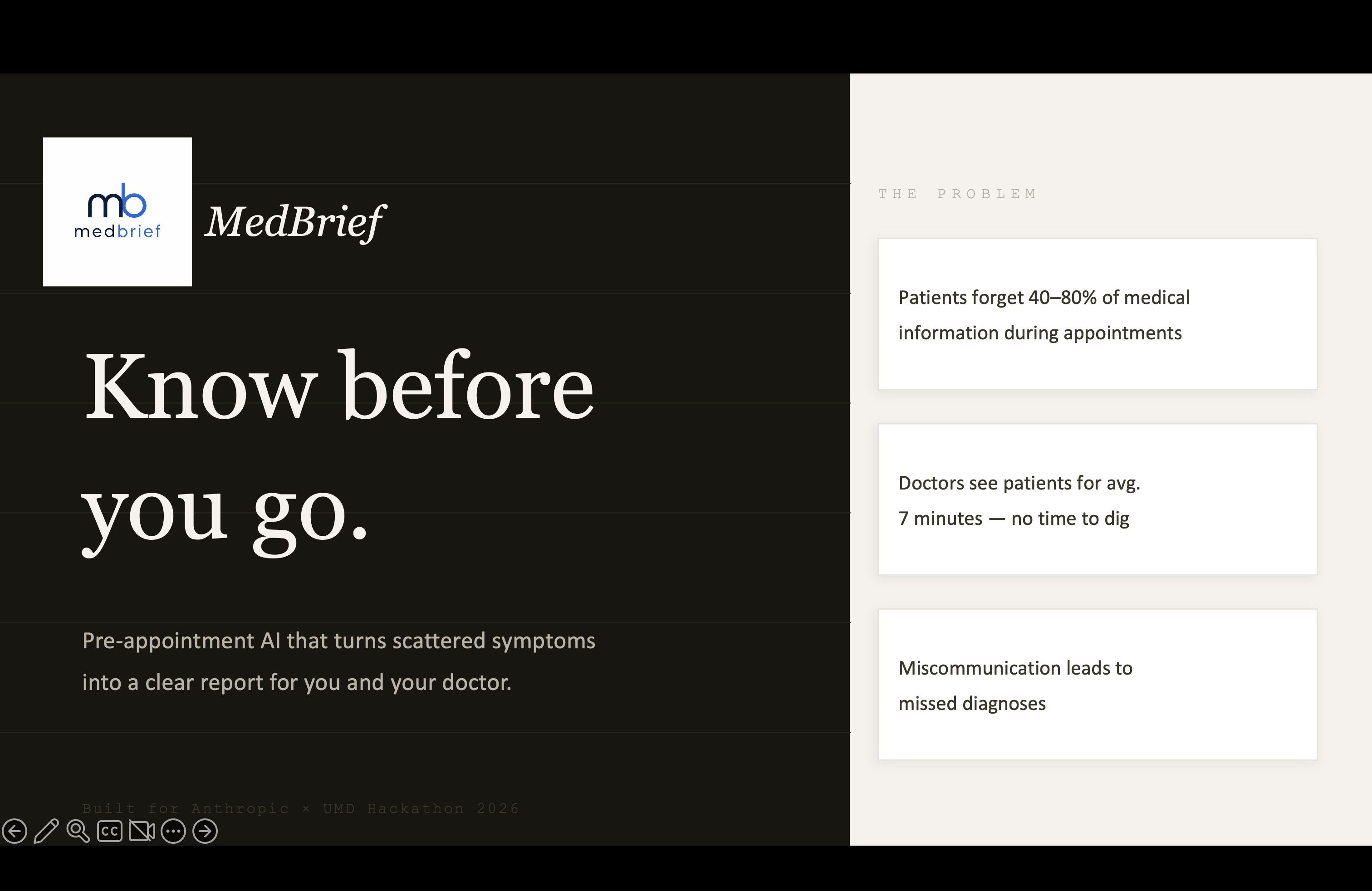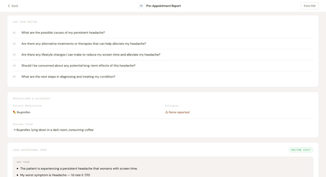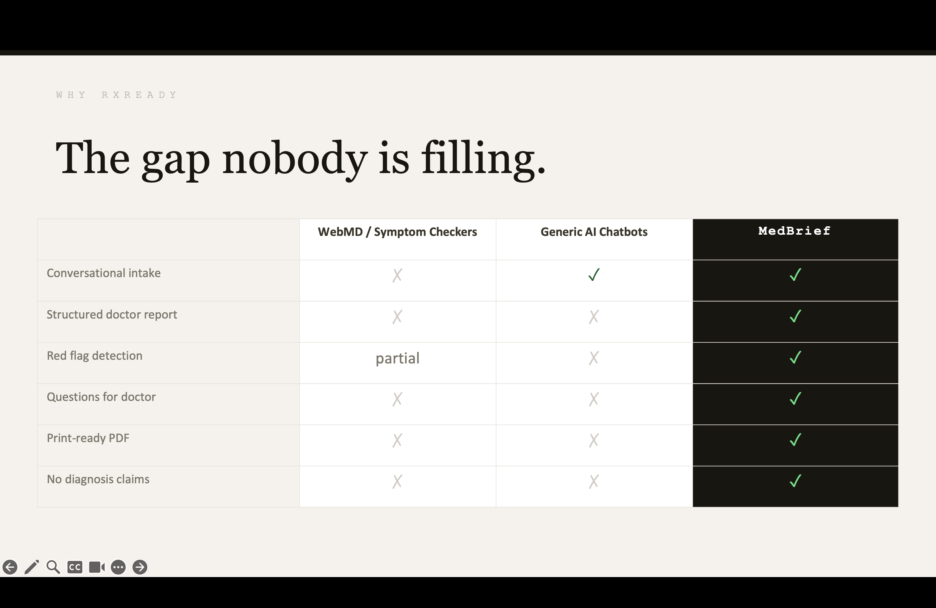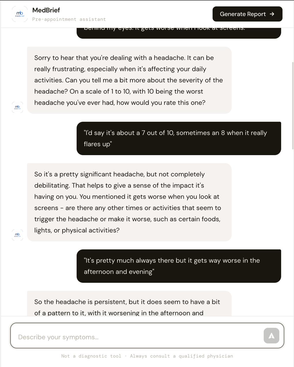Healthcare breaks down at communication. Patients forget symptoms, struggle to explain issues, and waste most of their ~18-minute visit figuring out what to say. We asked: what if patients could walk in as prepared as doctors?