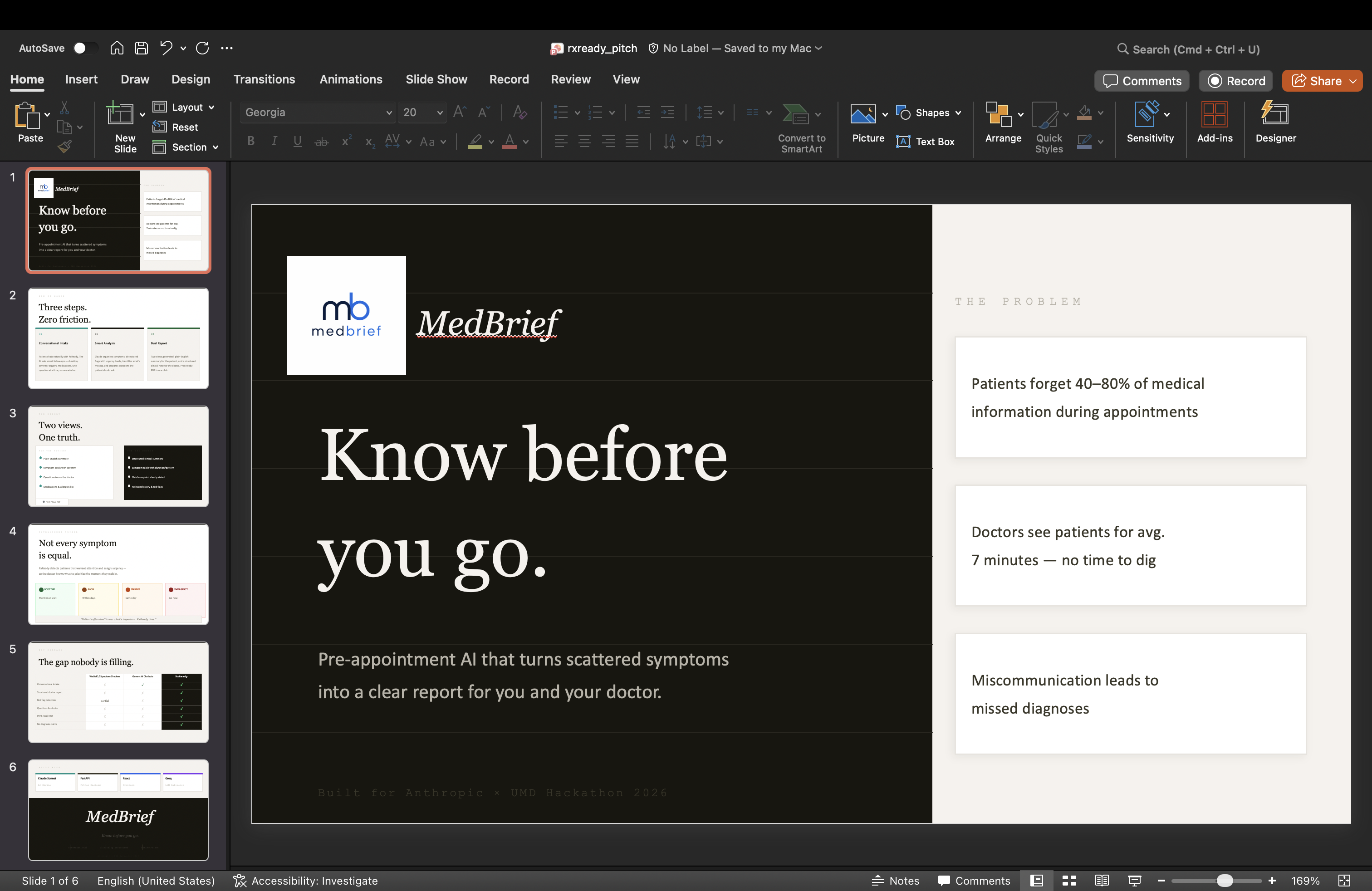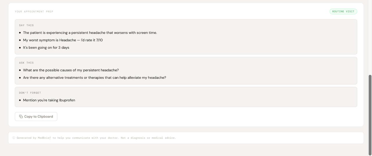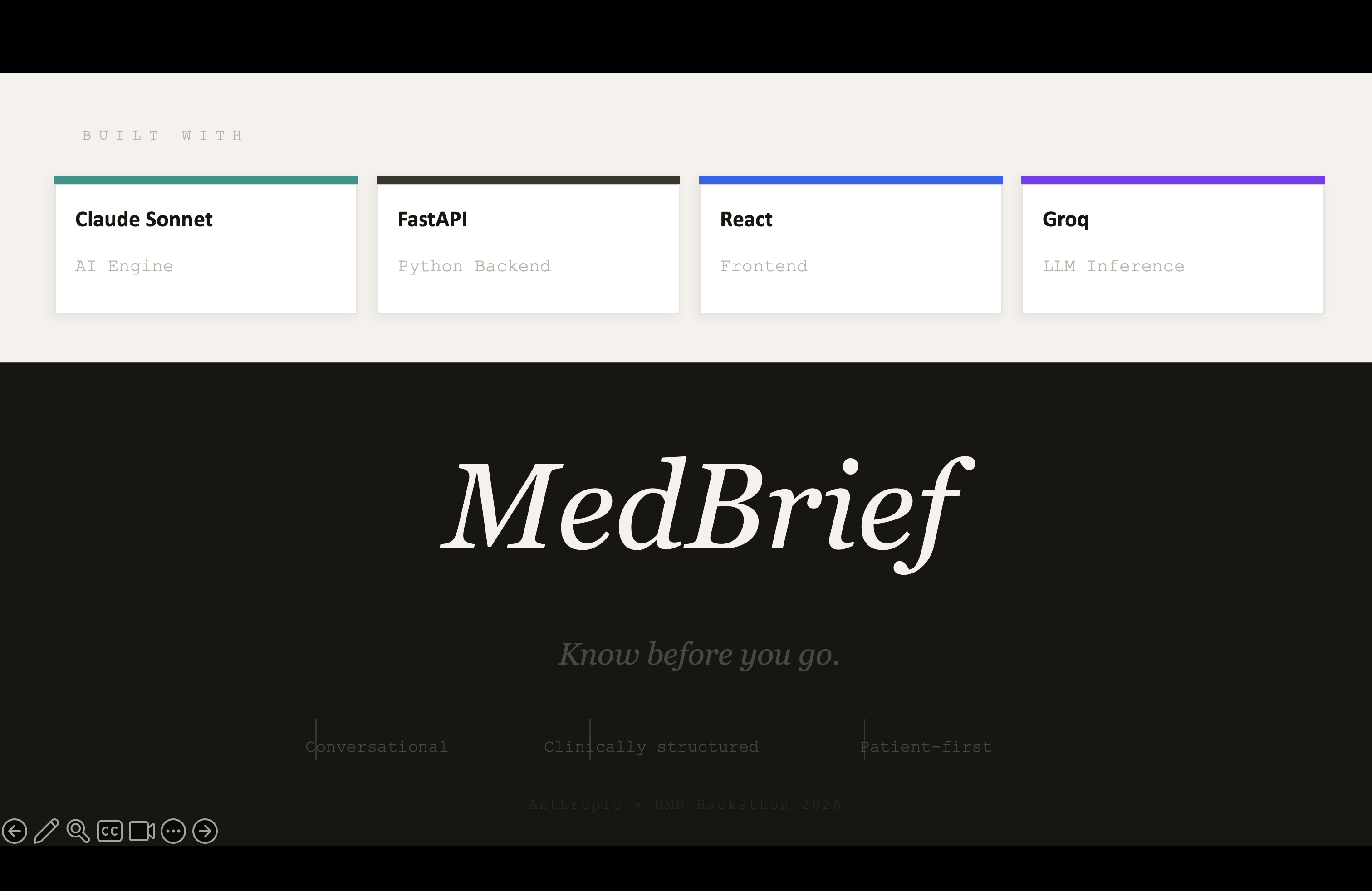MedBrief turns messy patient input into two outputs: a plain-English summary for the patient and a structured clinical brief for the doctor. It also suggests what to say, what to ask, and flags concerns—always as questions, never diagnoses.