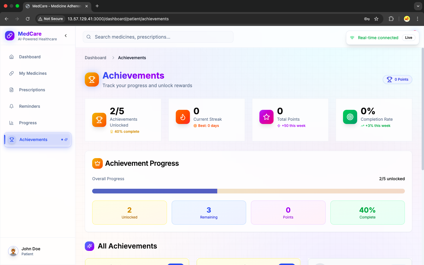 Behavior Change: The hardest challenge wasn't technical but human - designing a system that actually motivates patients to change their medication habits. Our gamification system went through multiple iterations before finding the right balance of incentives.