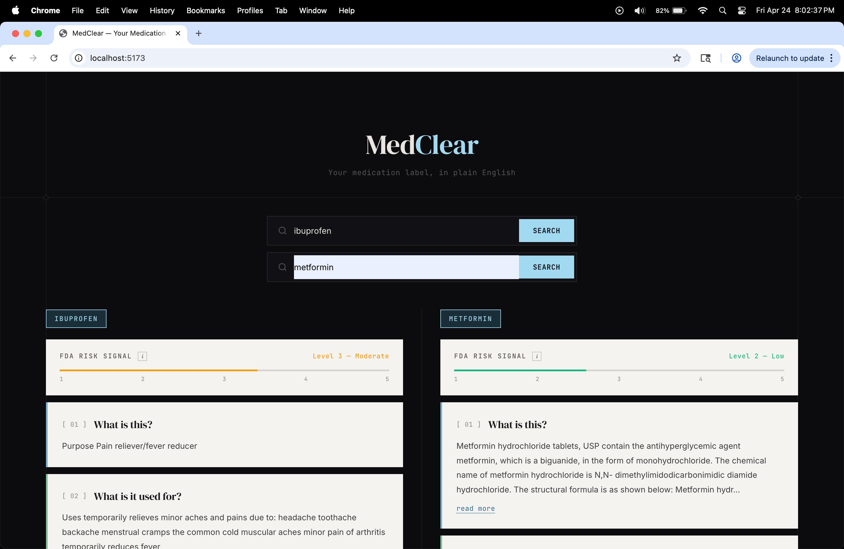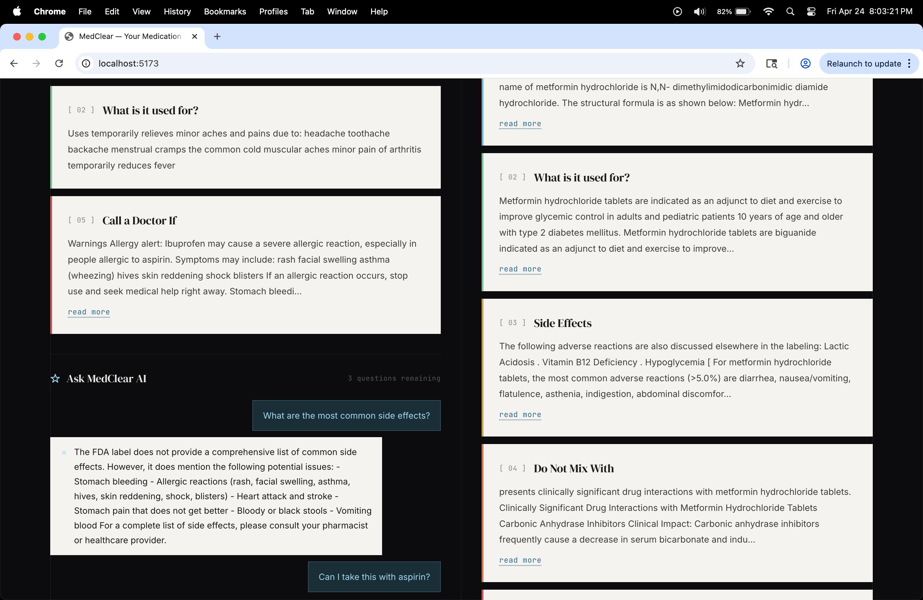 - The OpenFDA API returns inconsistent field structures across drugs — some fields are missing entirely for certain medications. We handled this with multi-field fallback logic and graceful error states.