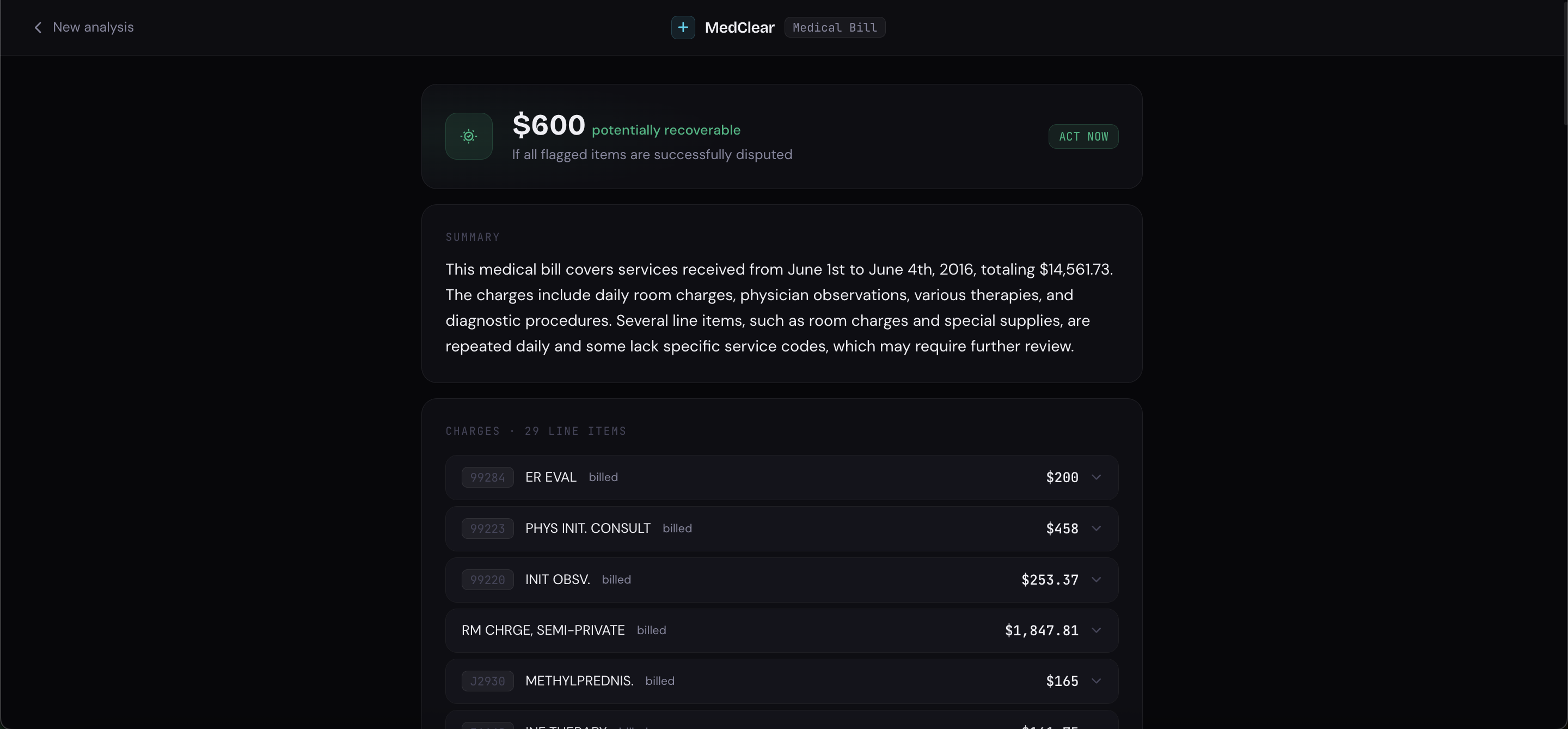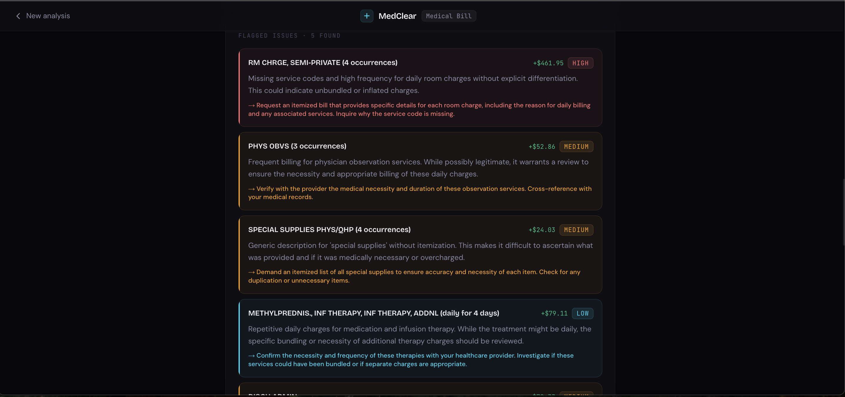 a plain-English breakdown of every charge, flagged issues with estimated