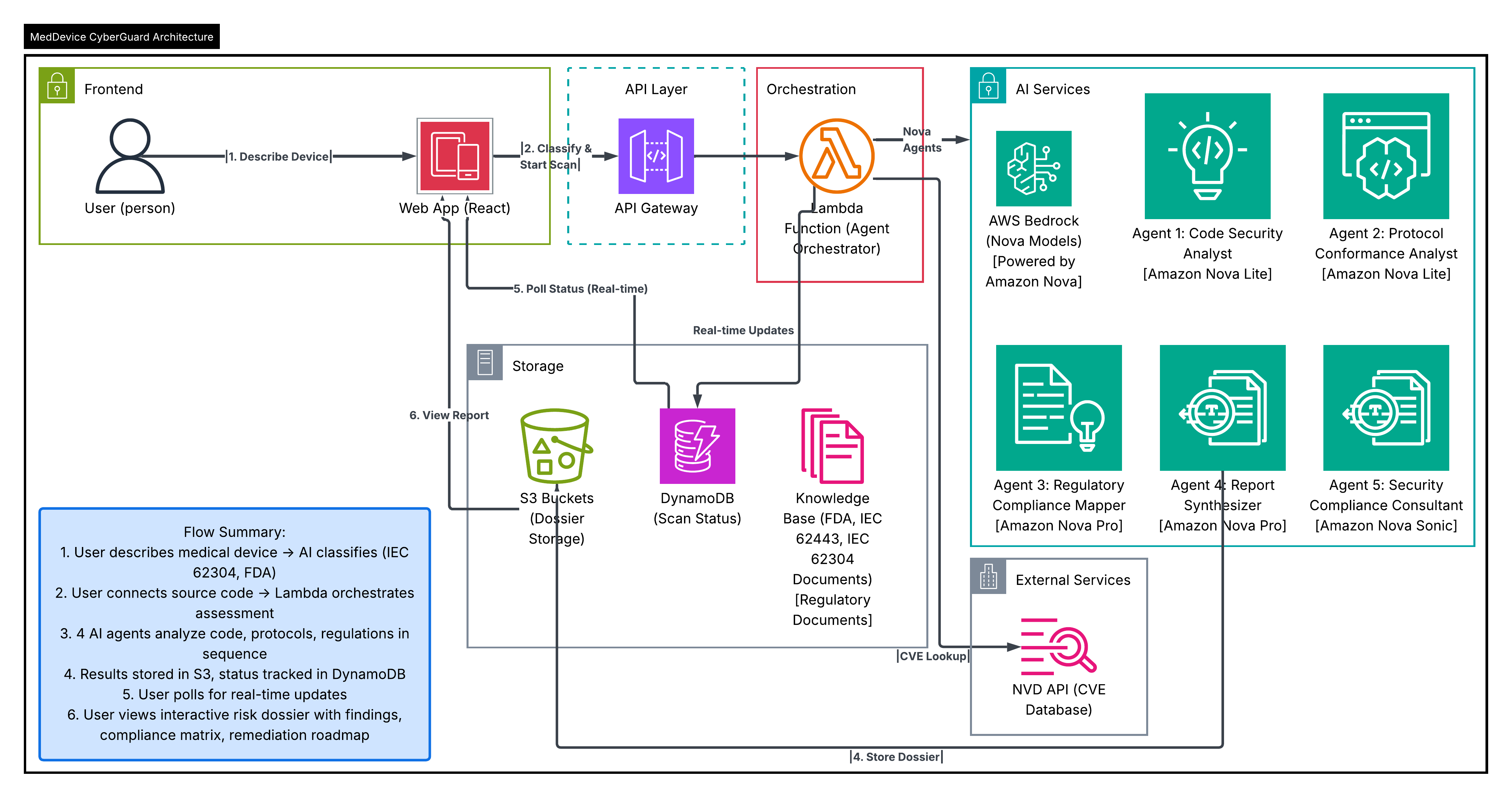 MedDevice CyberGuard is a multi-agent system powered by Amazon Nova that performs end-to-end cybersecurity assessment of connected medical devices.