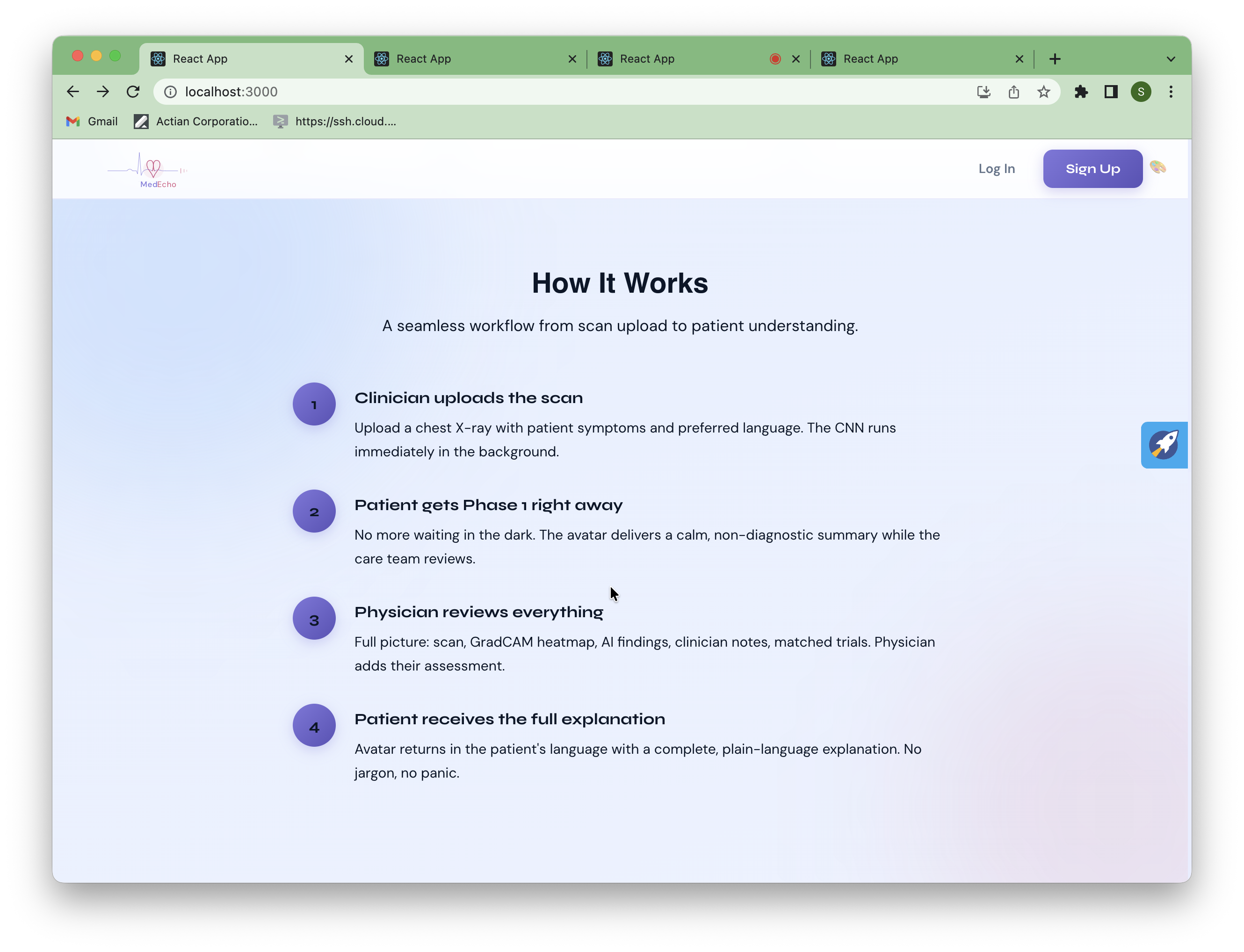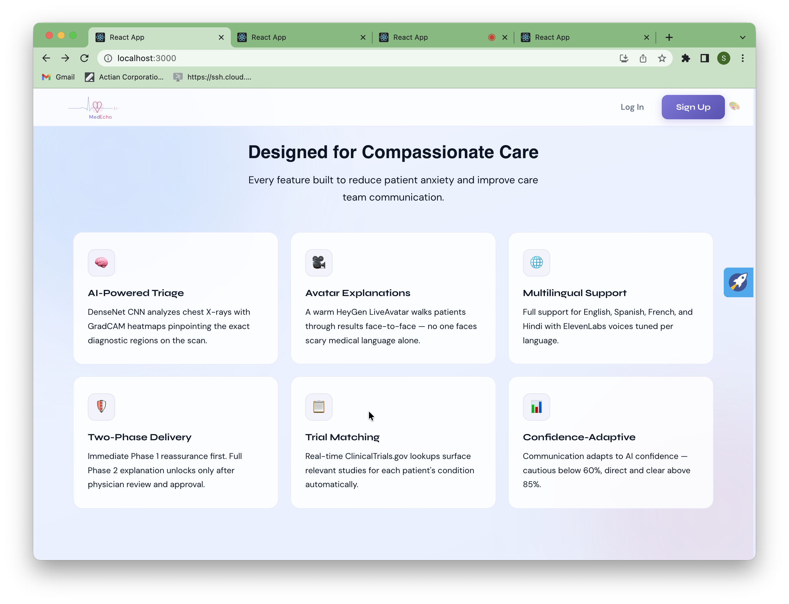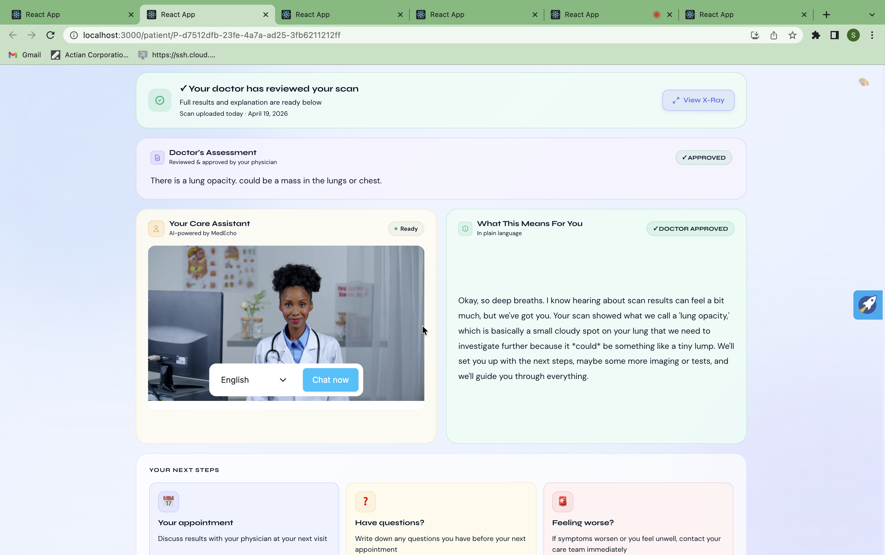 - A working end-to-end pipeline: scan upload → CNN → GradCAM → Gemini → ElevenLabs → HeyGen avatar → patient explanation, all in the patient's language
