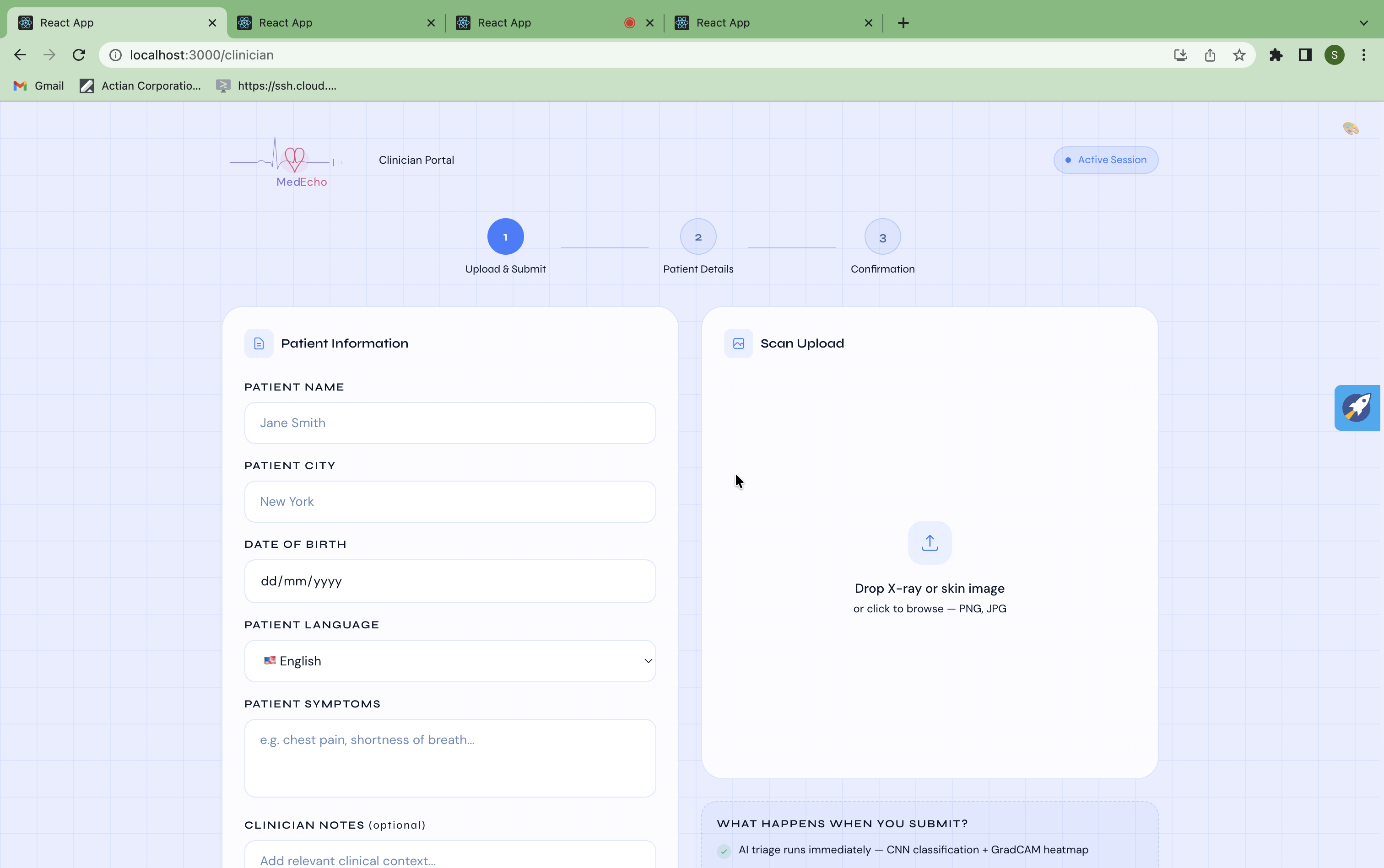 The clinician uploads a scan, enters symptoms and patient language. Immediately: