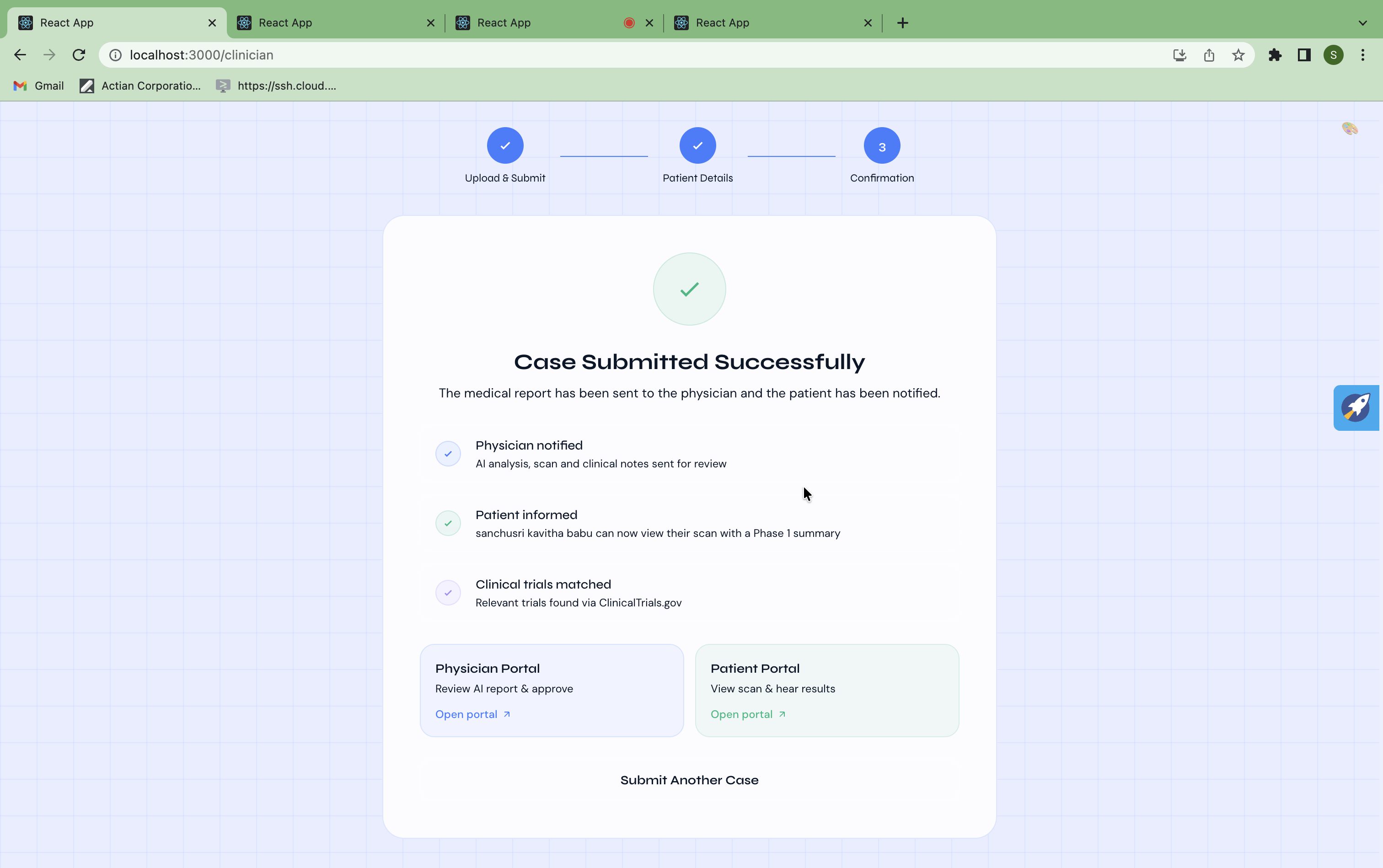 /clinician,/physician,/patient - Real-time polling on the patient portal switches from Phase 1 to Phase 2 the moment the physician approves