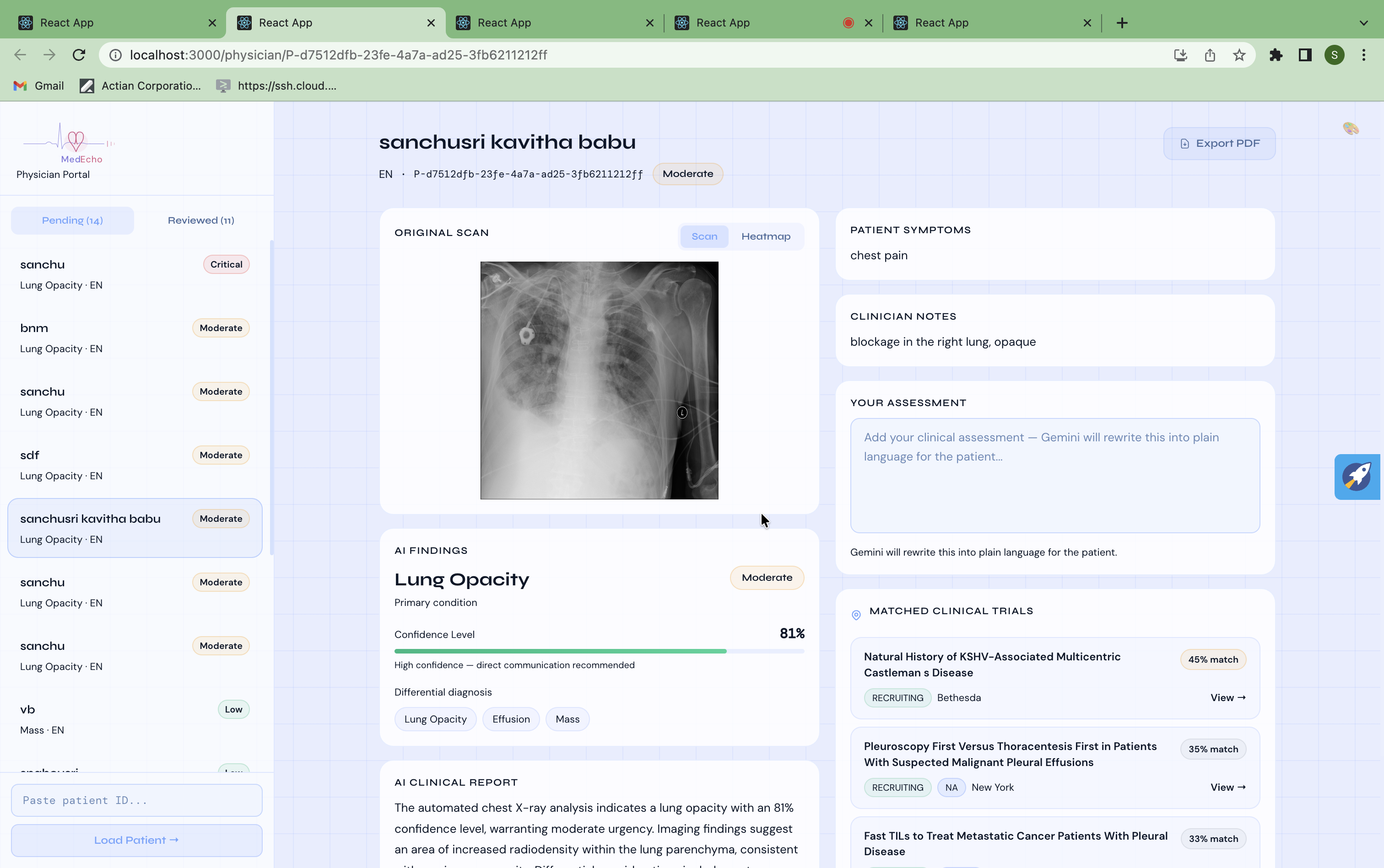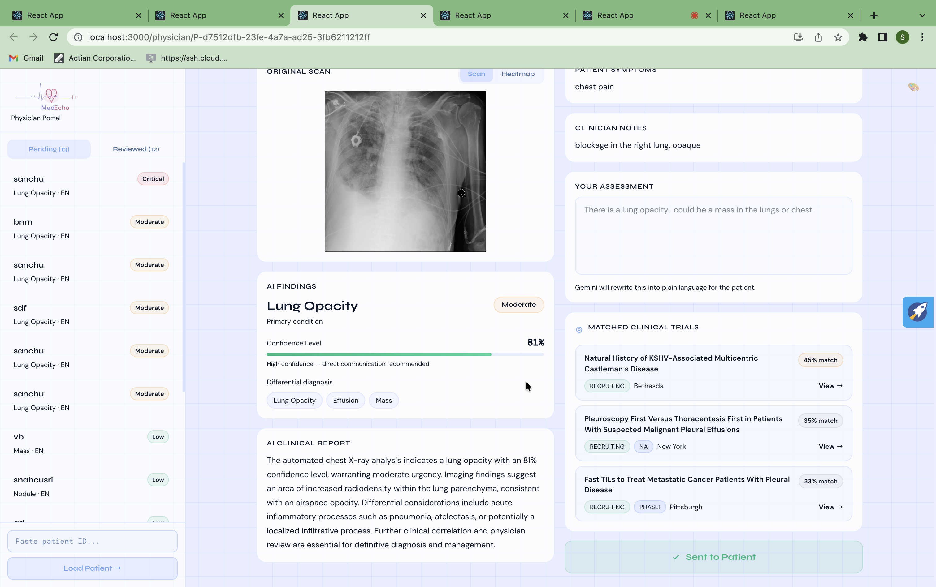 - Physician sidebar loads live cases with urgency badges, condition tags, and trial match confidence scores sorted by severity