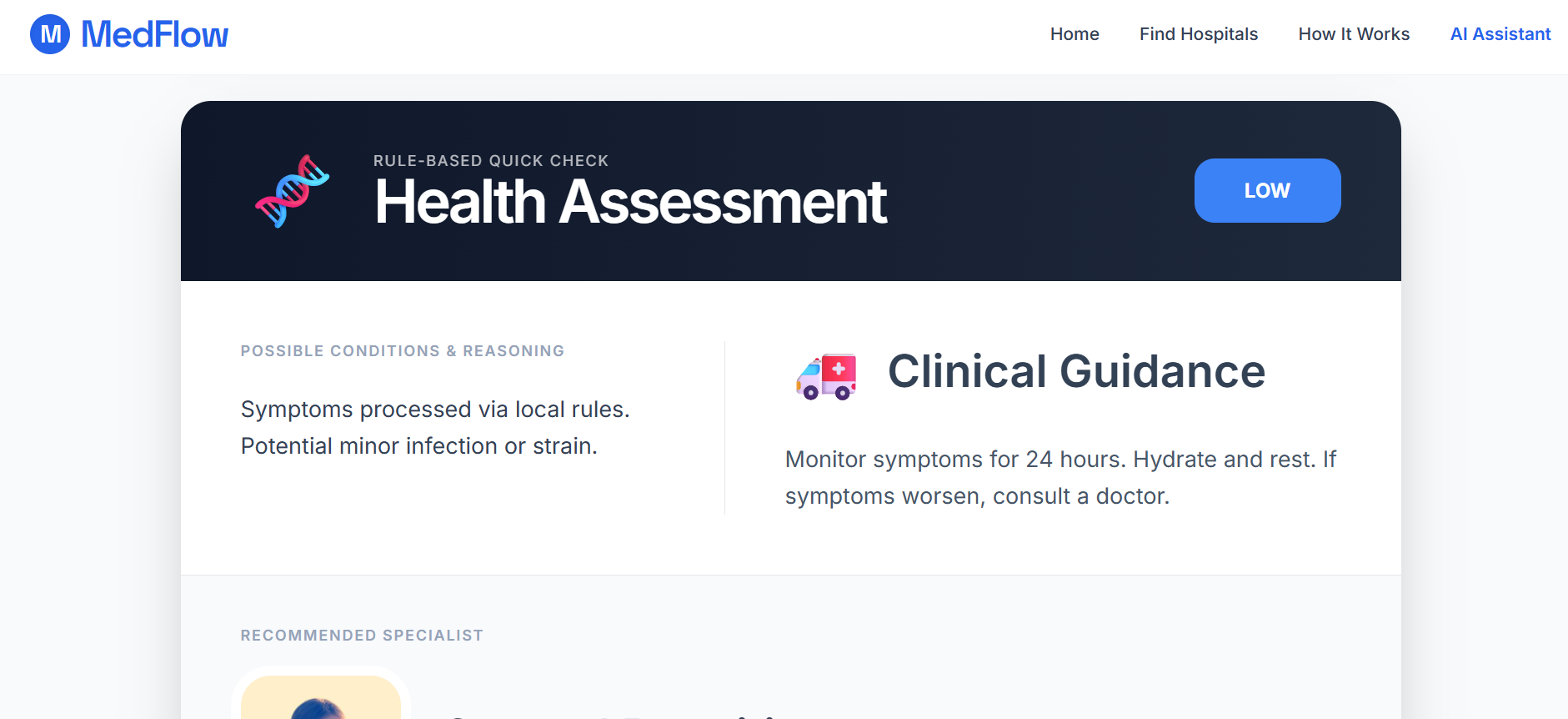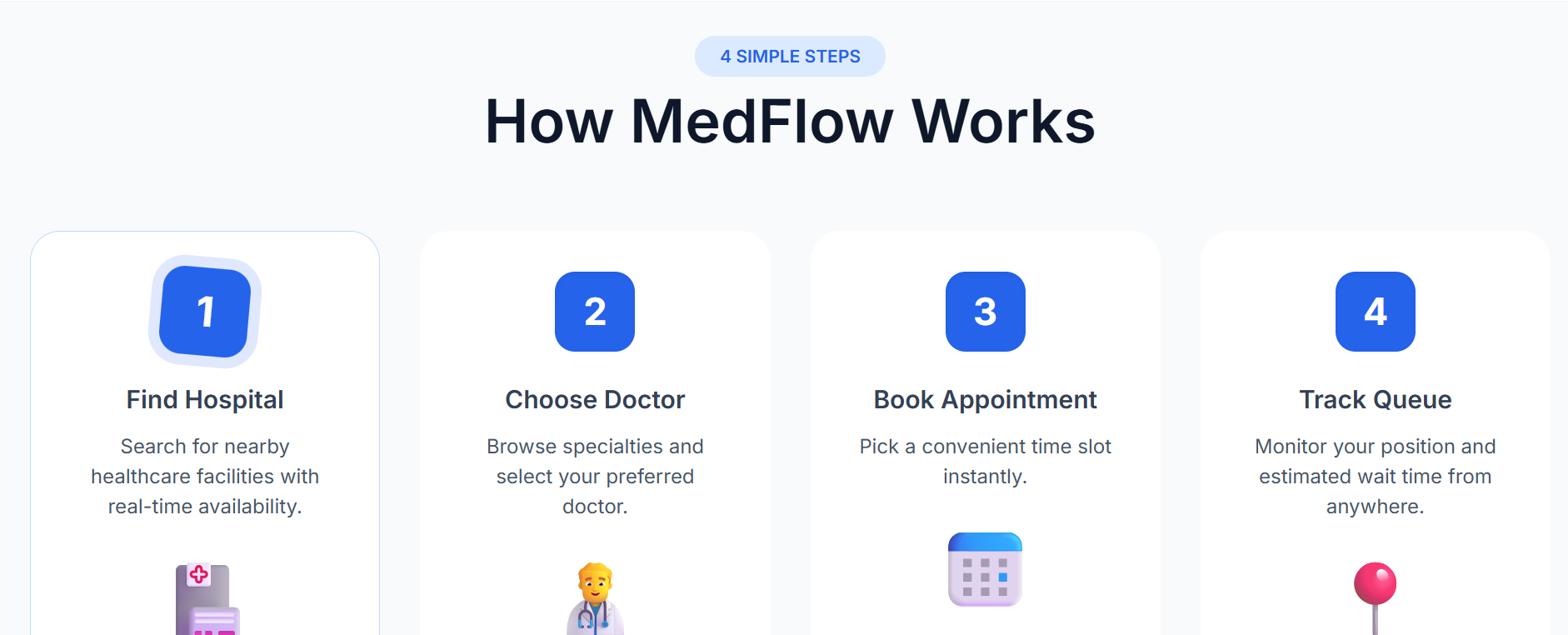 The idea for MedFlow came from a real experience. I went to a hospital with my grandfather, and after waiting for a long time, we briefly stepped out — only to miss our turn.