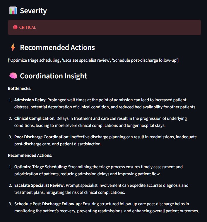 We learned how specialized AI agents can collaborate to monitor workflows and support real world decision making. The project also deepened our understanding of healthcare data coordination and the importance of building AI systems that are reliable, explainable, and practical.