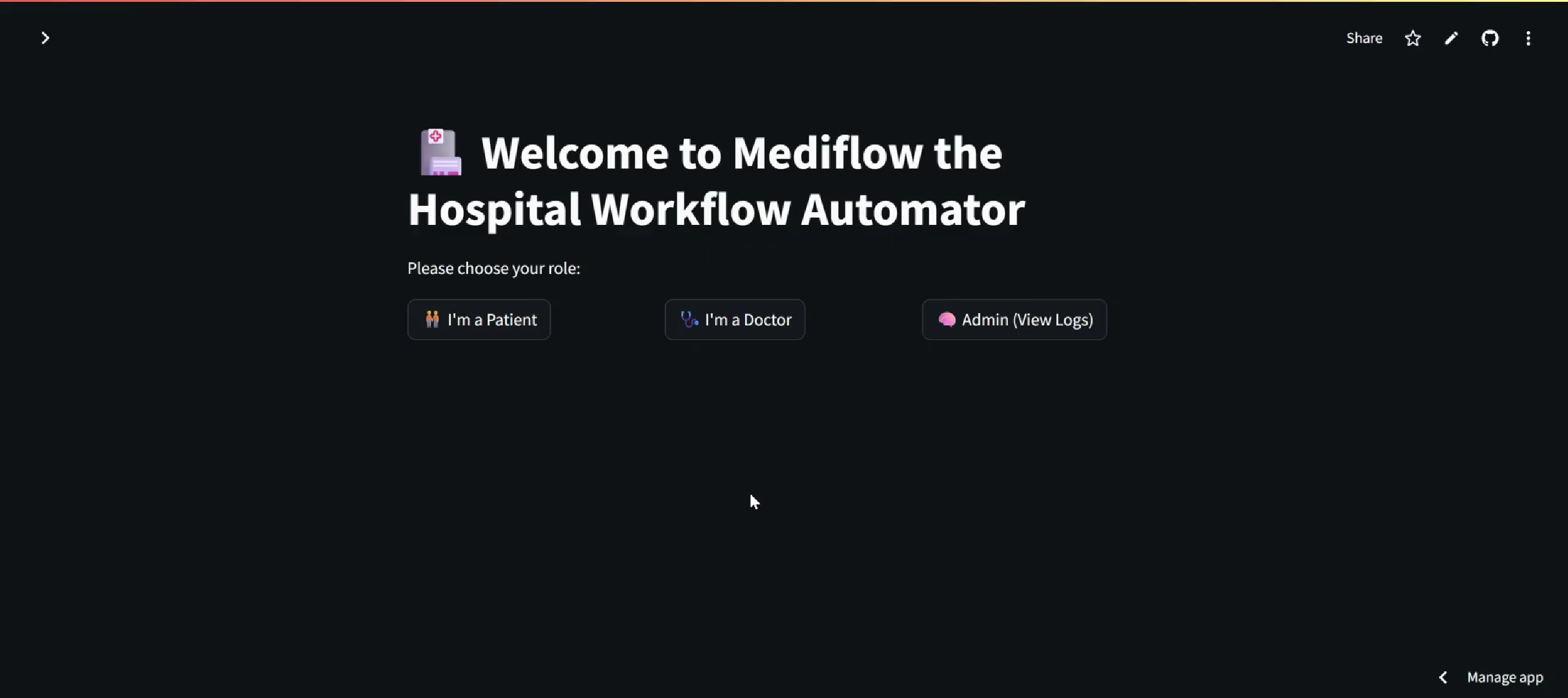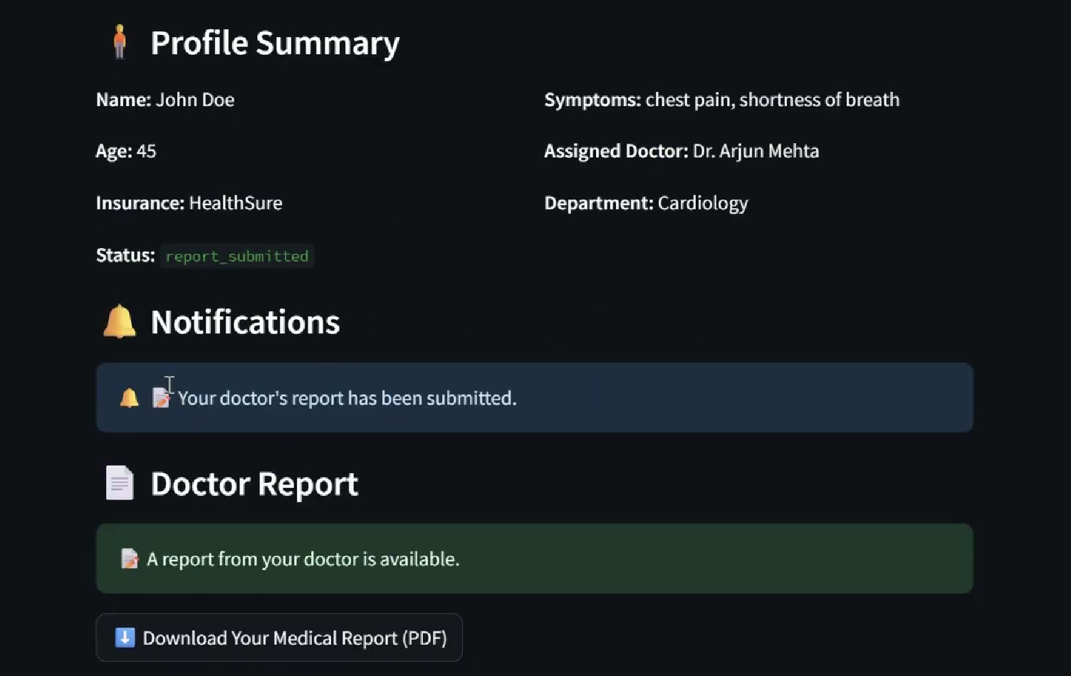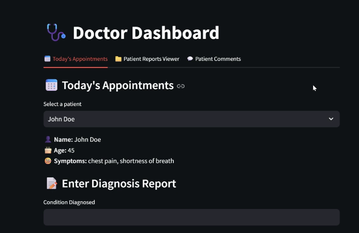 - Designed a clean Streamlit UI with real-time updates, doctor and patient dashboards