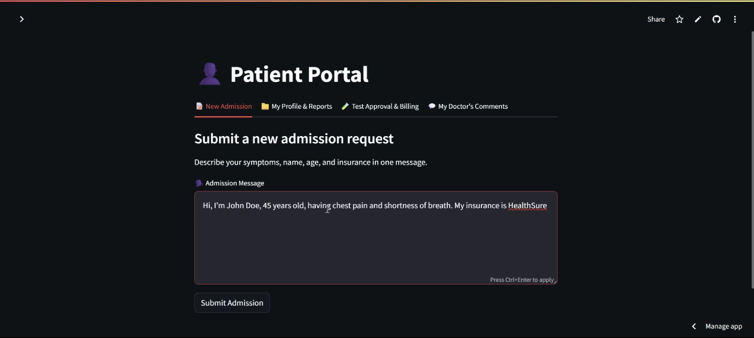 - Admits patients via natural language input