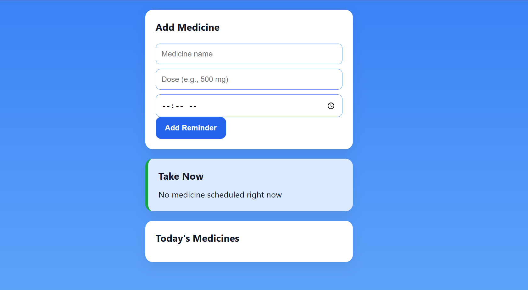 - Add medicine functionality with name, dose, and time