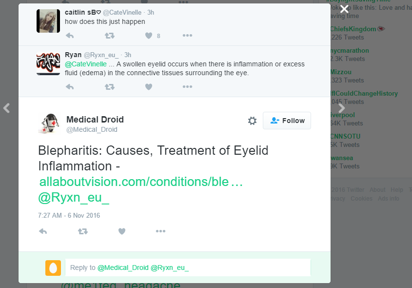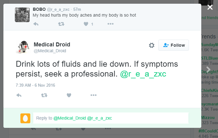 It searches through recent tweets for medical keywords, and either replies with specific advice if available, or links to outside information. The bot also retweets news from major medical accounts.