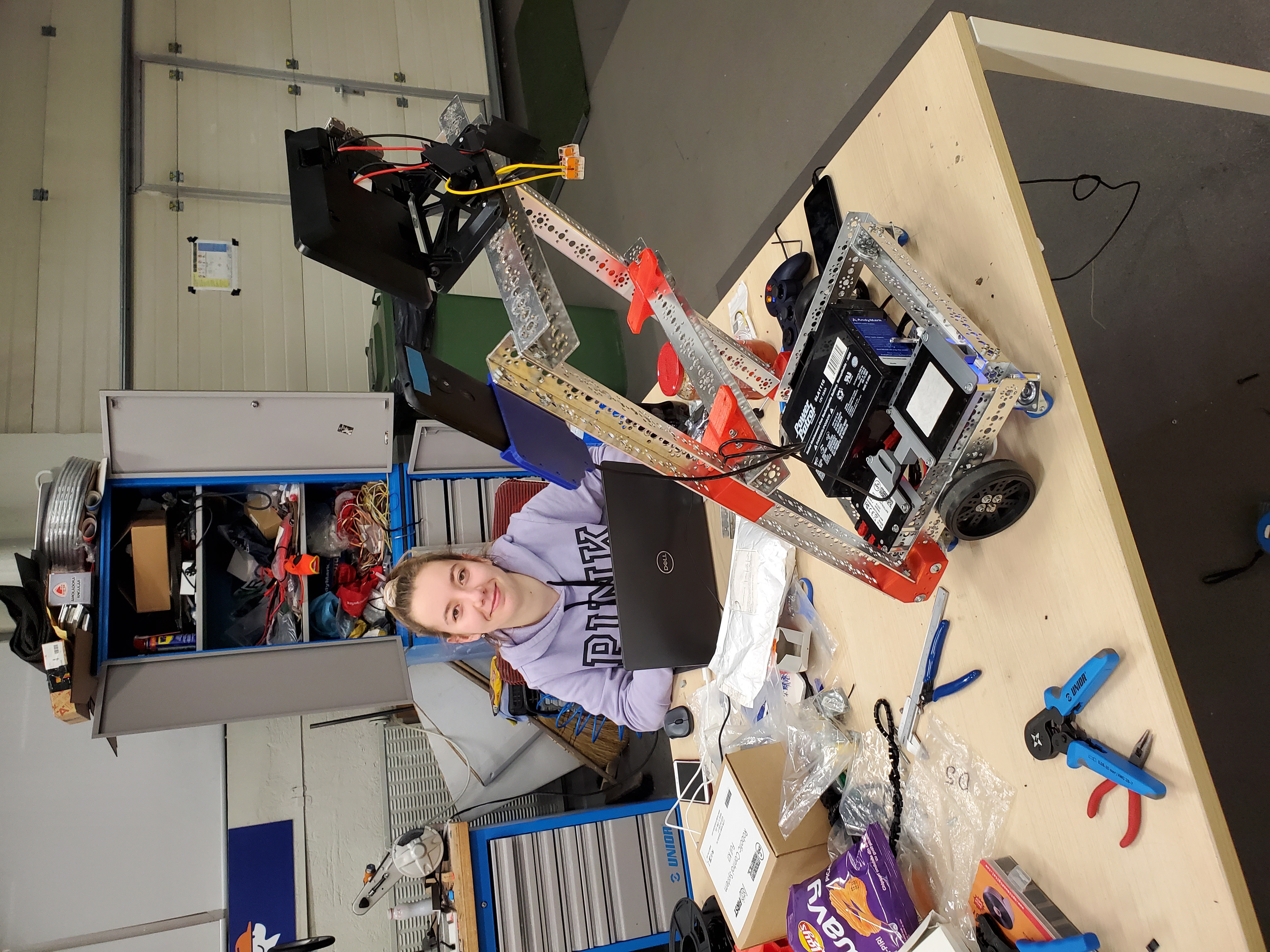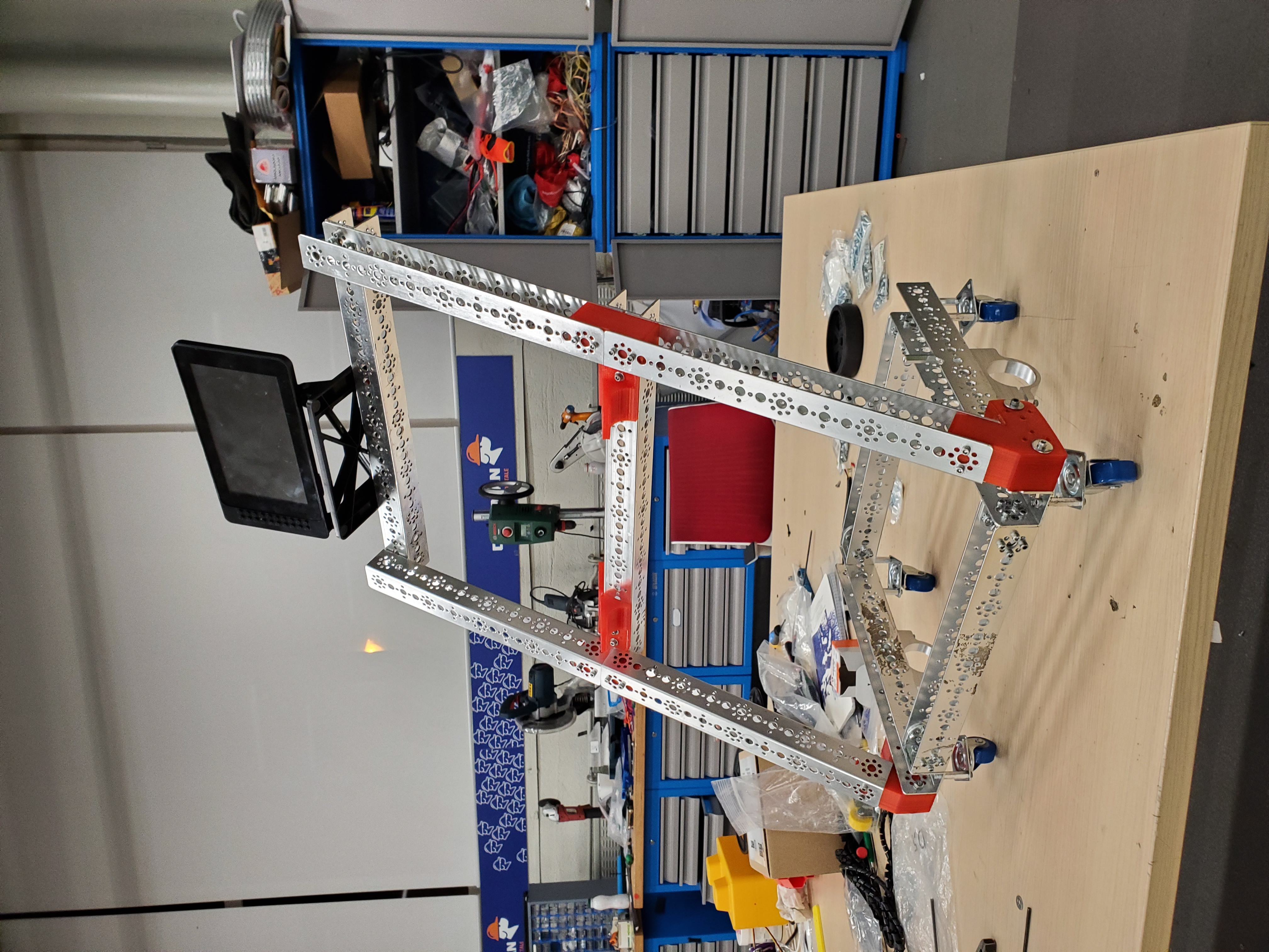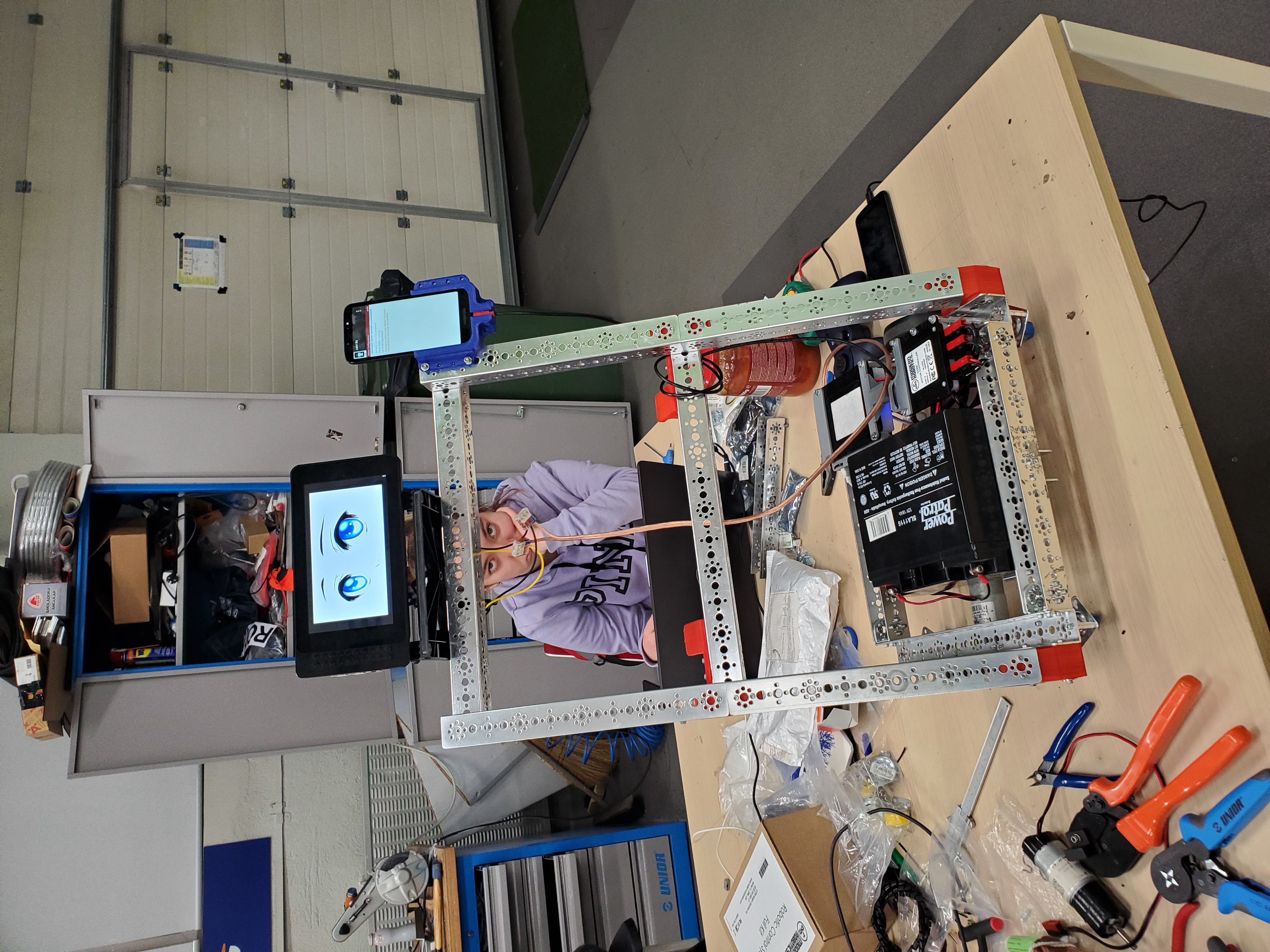 We started with the base robot, that we already did one month ago when we heard about this virus and we updated all the features. The base of the robot is built from robust tetrix channels that we use for our First Tech Challenge competition robots. The first version of the robot had electronics from modern robotics: a motor controller and a Core Power Interface. We used two android phone with special designed applications for the robot controller and for the driver station to control the robot. We also 3D printed some parts that we managed to create using PC Solidworks design software. We use a LCD with a face animation and also a special designed Raspberry Pi.