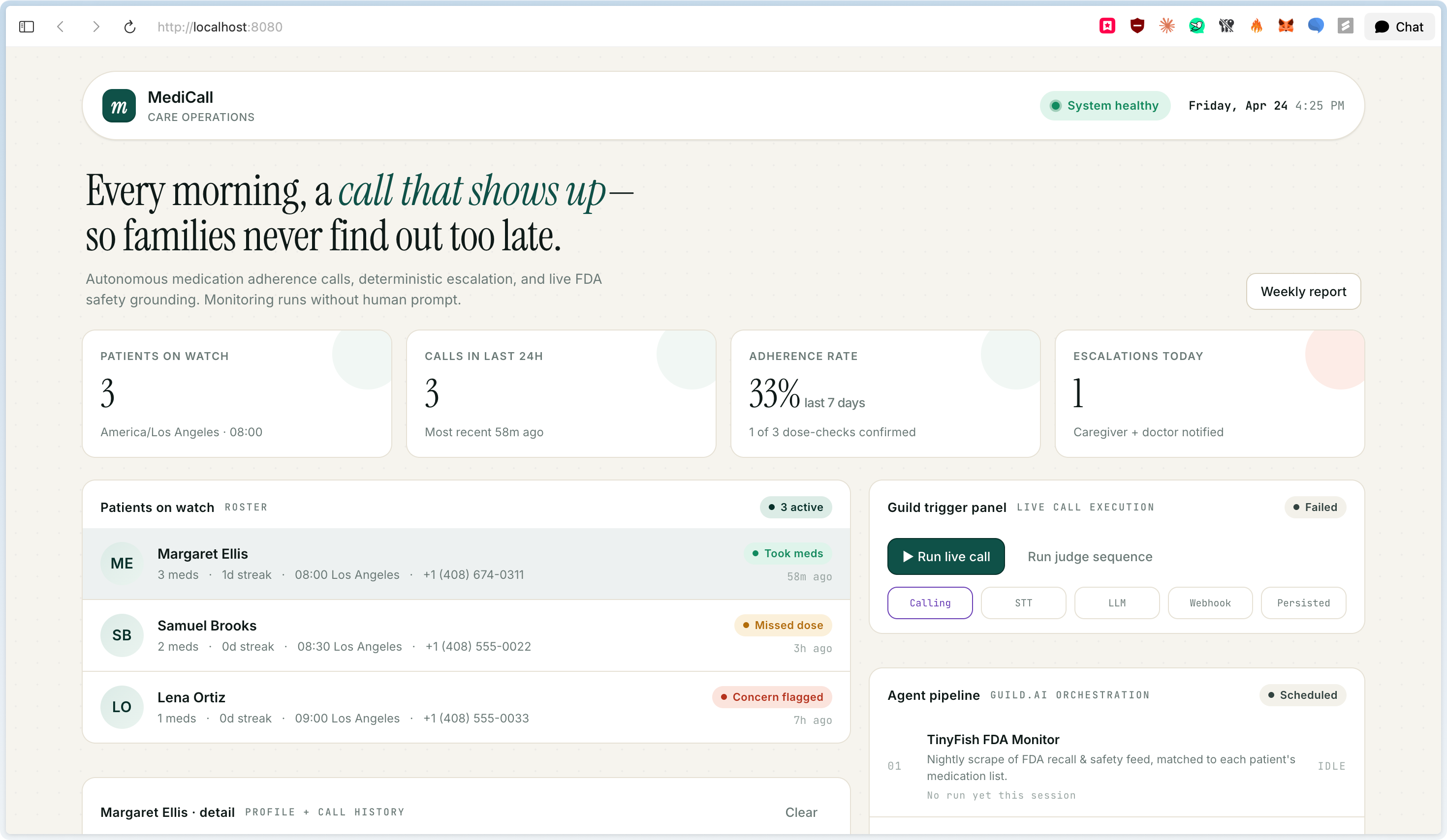 Guild.ai is the backbone of MediCall. We built a fleet of four code-first autonomous agents running on Guild's auto-managed runtime — each one handling a critical piece of the patient care pipeline: