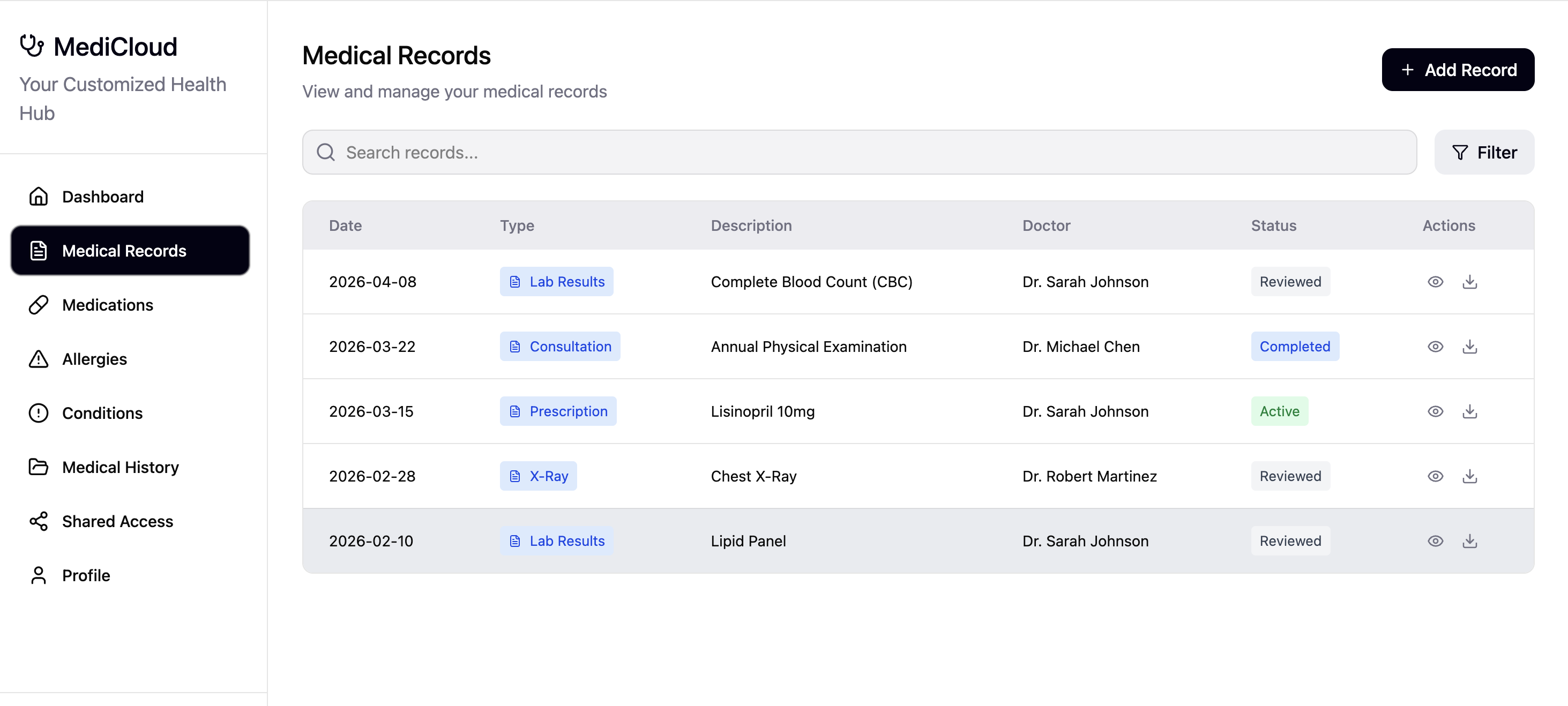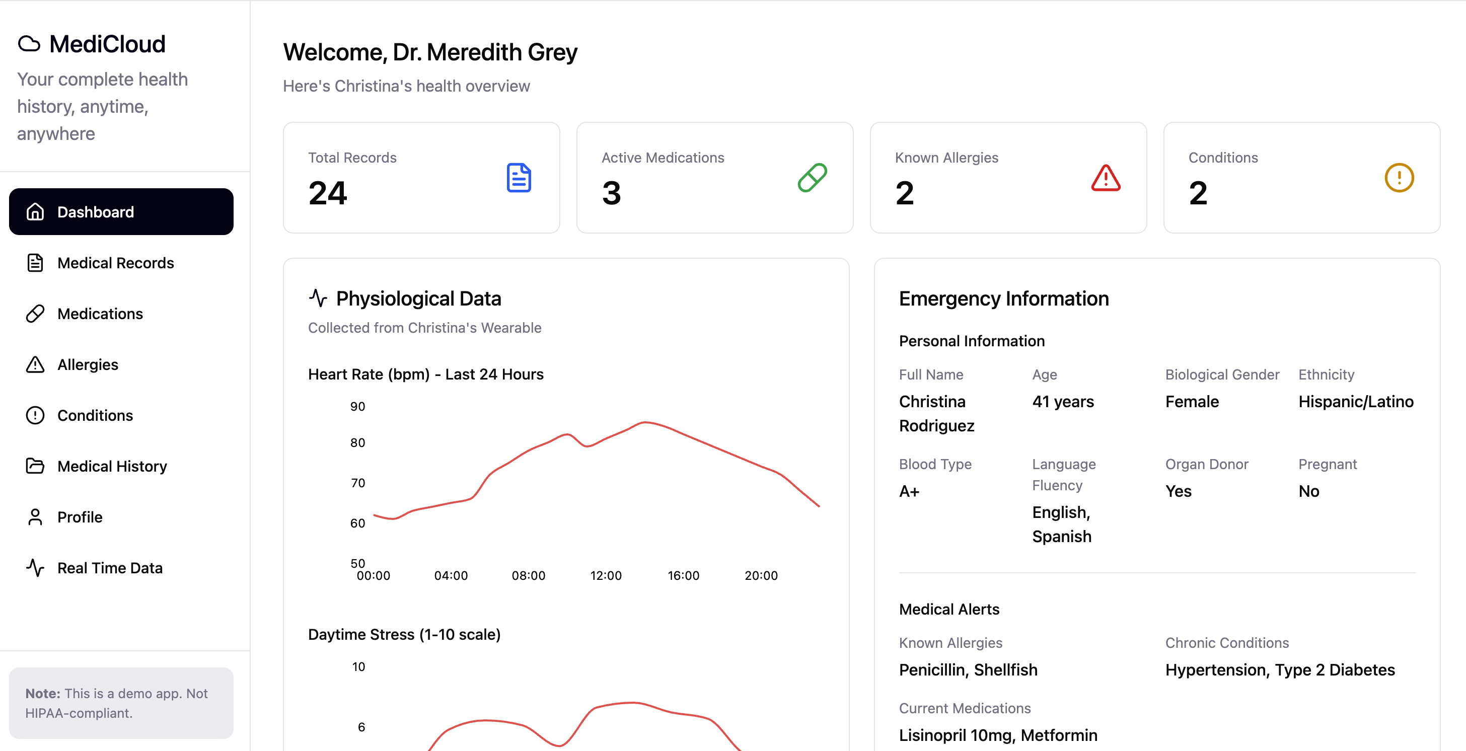 To address the gaps in clinical utilization of both medical history and wearables data, we propose a combined application and applications programming interface (API), MediCloud, that consolidates and processes health data from a variety of sources. This method could be especially impactful for clinicians when interacting with patients with chronic, emergent, or highly complex conditions, as their treatment includes recurring hospital visits, consultations, treatments, and tests. Providing a physician with an easily accessible and up-to-date source of information can ensure correct diagnoses and care to the best of the physician’s ability while alleviating the time and effort required to synthesize a patient’s healthcare data.