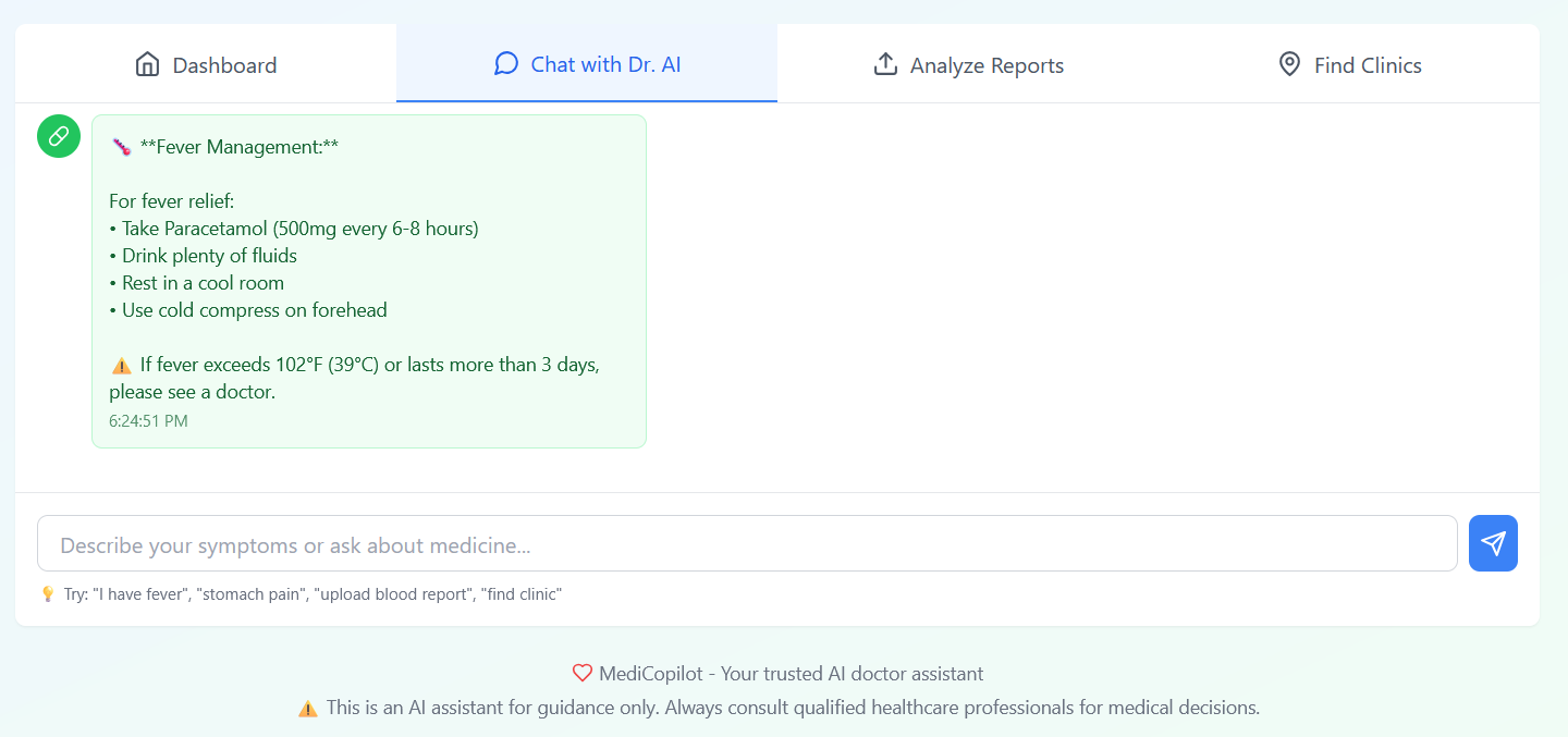This inspired us to create MediCopilot — a friendly, accessible, and AI-powered health assistant that can chat with users, analyze test reports, and provide safe, general medical suggestions.