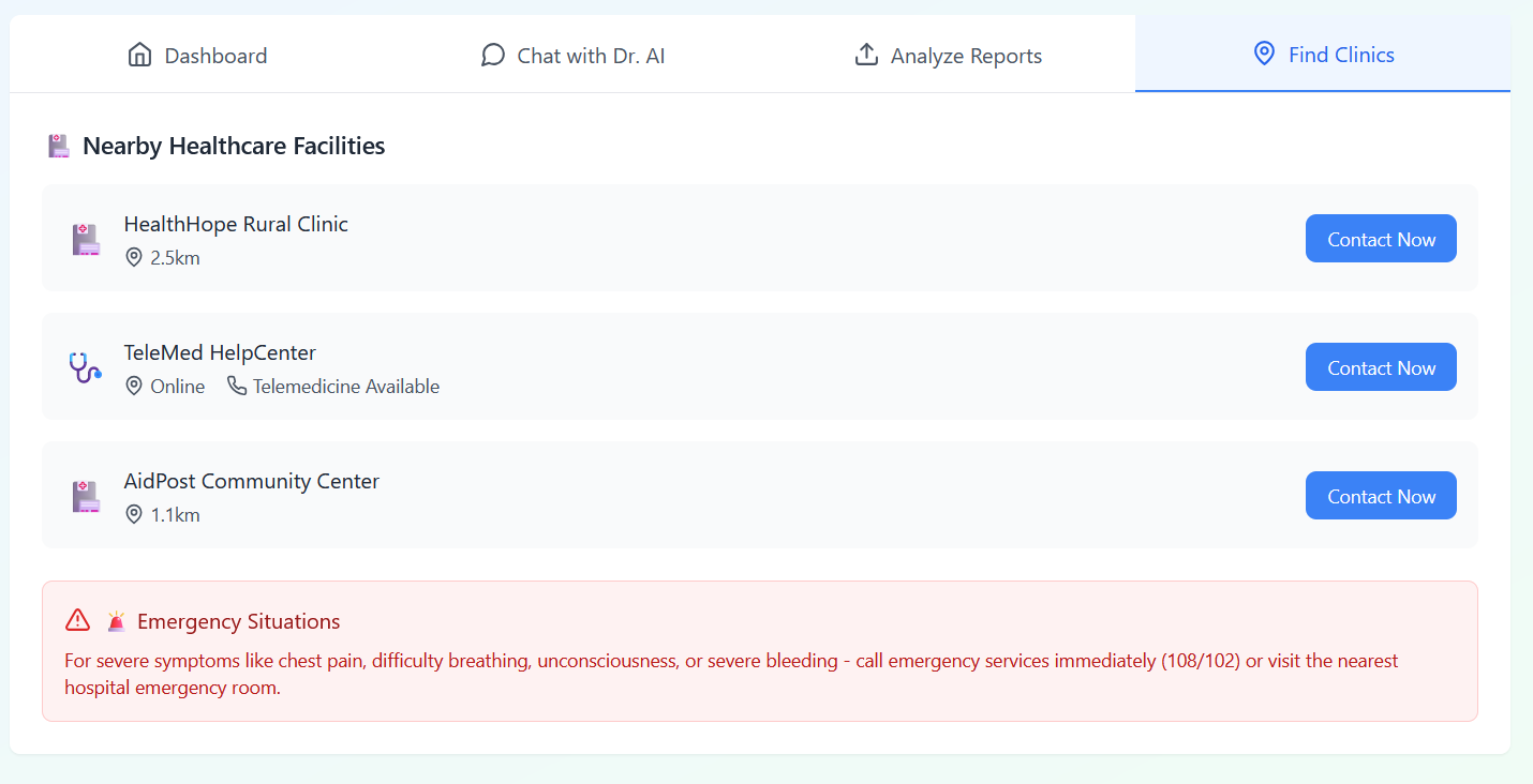 - Successfully integrated file upload simulation, emergency detection, and multilingual support.