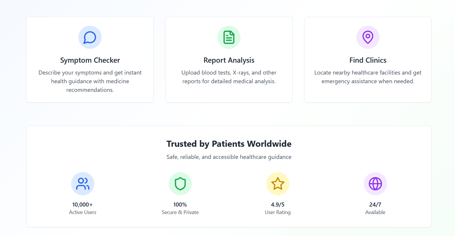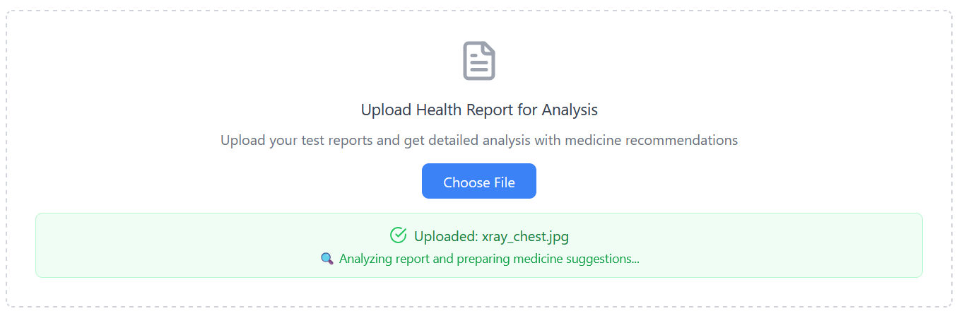 - Offers safe medicine suggestions based on symptoms or uploaded files