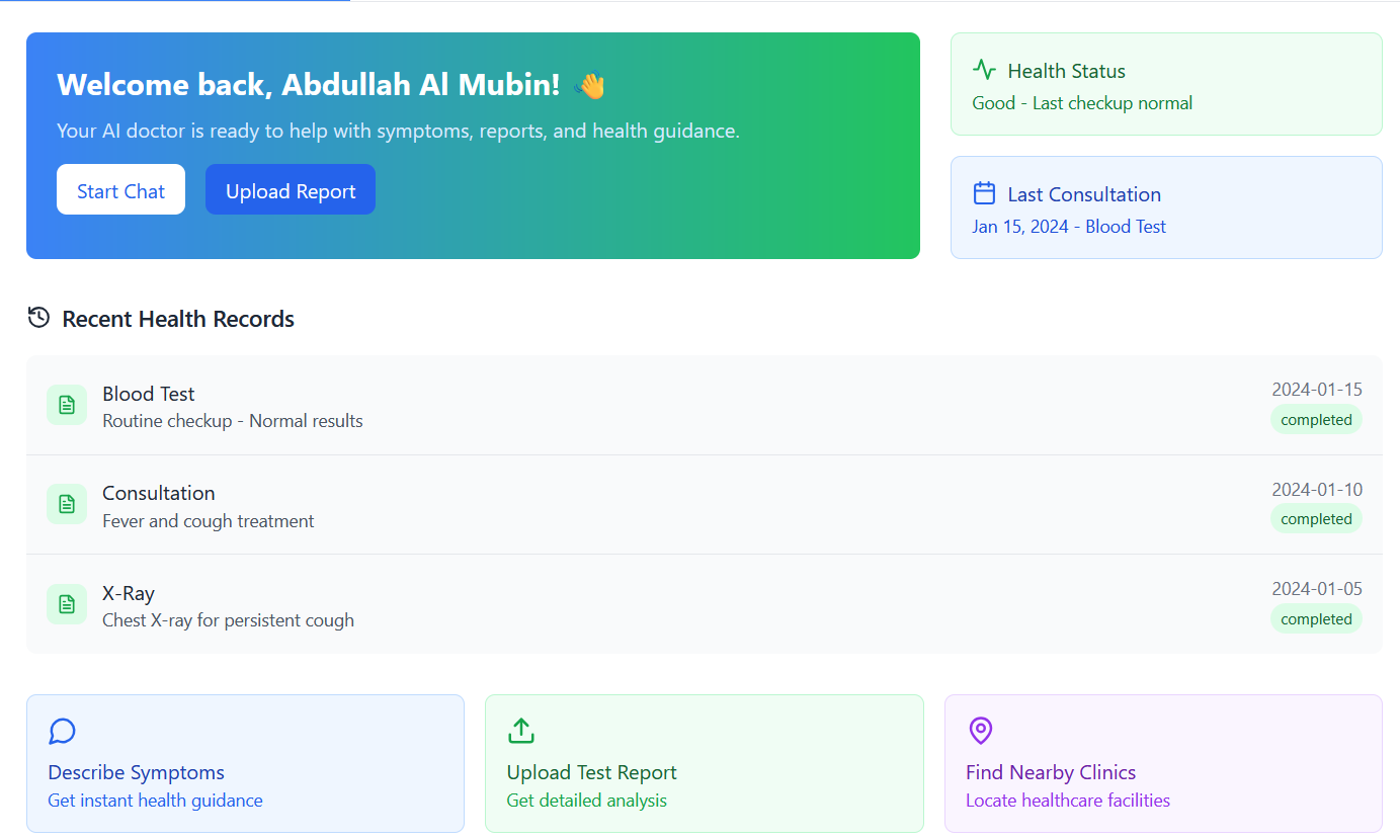 - Simulating realistic AI medical advice without violating safety boundaries — we had to carefully design the Bolt AI prompt to remain ethical and non-diagnostic.