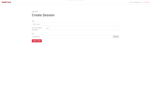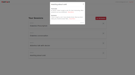 MediCord lets users create accounts to store their records of doctor visits, or sessions. After creating an account, a user can add any number of sessions, each with a title and an uploaded audio file (a recording of a doctor visit). After inputting this information, our web application uses machine learning to transcribe that audio file into text and summarize it. Each account stores all of the sessions a user has ever made, which means users can keep track of their medical records for a long time.