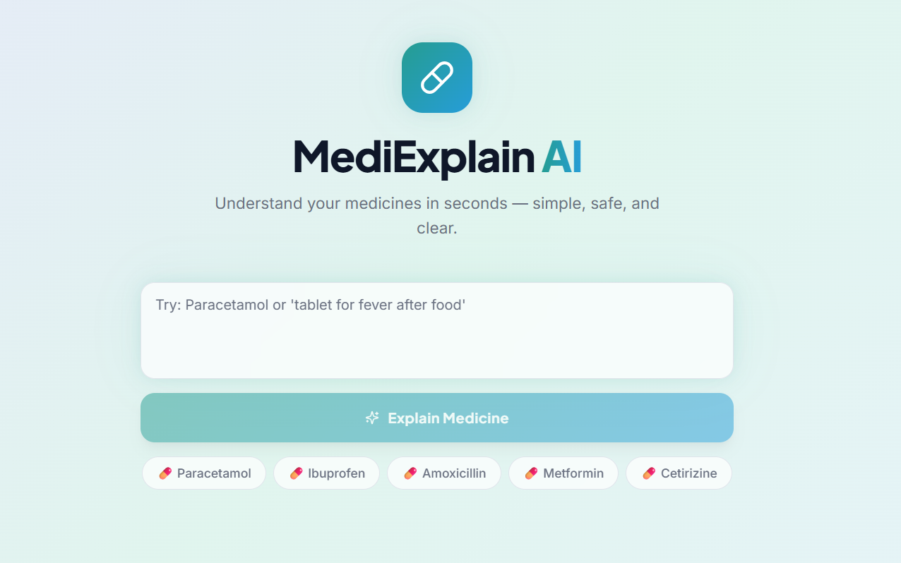 MediExplain AI is a Generative AI-powered web app that explains medicines in simple language. Users can enter a medicine name or prescription text and instantly get: