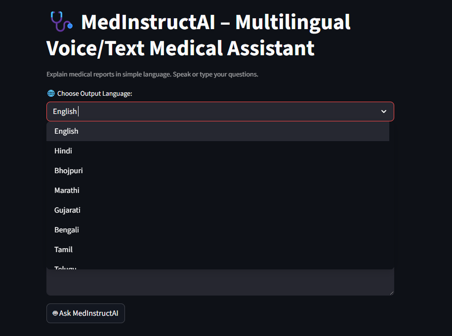 MedInstructAI acts as a multilingual AI health educator that reads medical reports or text, understands them, and explains everything in simple, student-friendly language — both in text and voice. Key features include:
