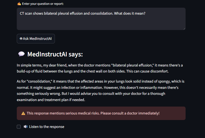 While volunteering in rural health camps, I noticed that most patients and even biology students couldn’t understand their own medical reports. Terms like hemoglobin, bilirubin, or ECG abnormalities sounded alien. This language gap not only affects patient awareness but also prevents students in rural or non-English-medium schools from learning medical science effectively. That’s where the idea for MedInstructAI was born — to make medical learning accessible, multilingual, and interactive through the power of AI. If AI can help doctors diagnose faster, why not help students learn medicine smarter?