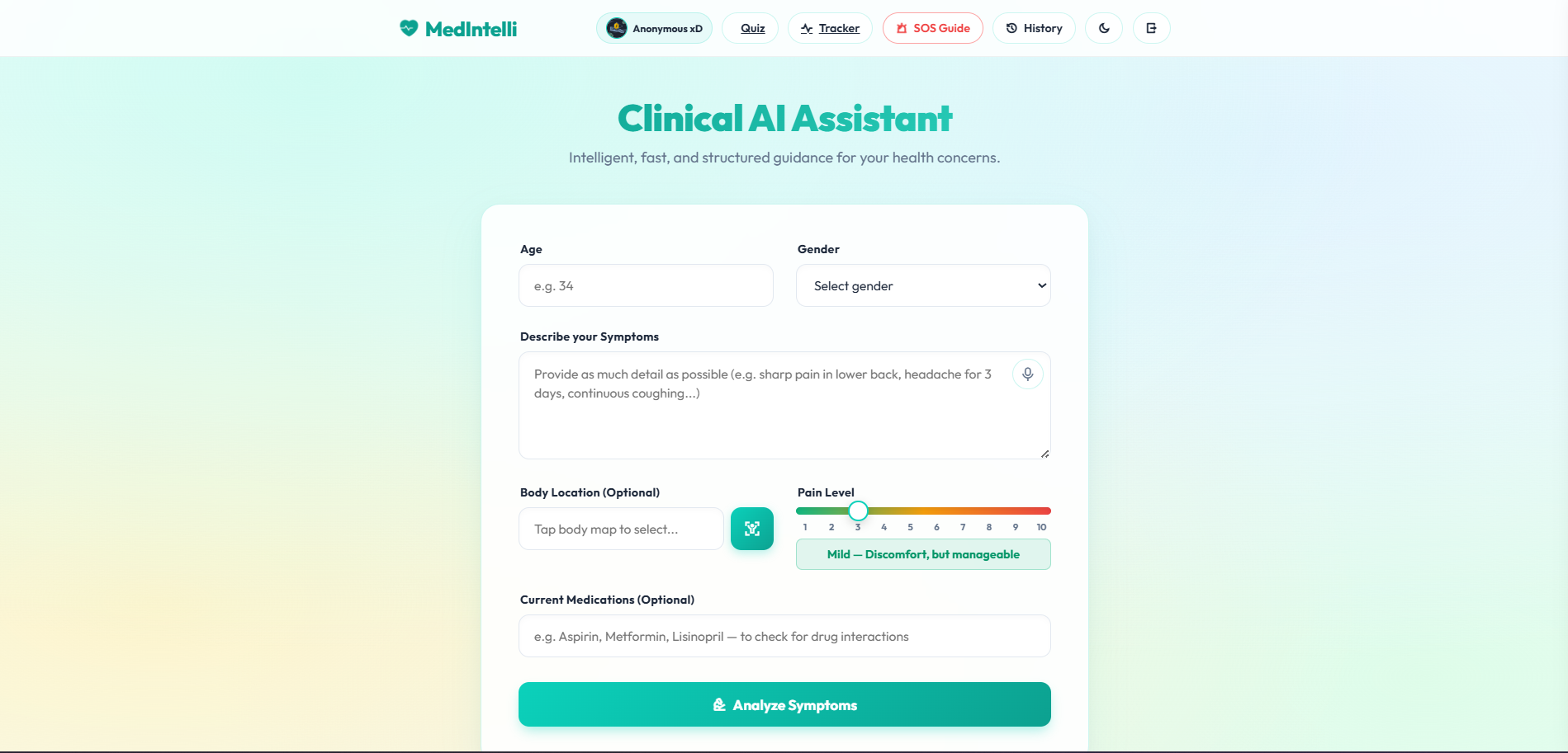 🎙️ Voice Input — describe symptoms naturally using speech 🫀 3D Body Map — tap directly where it hurts on an interactive body diagram In seconds, our AI analyzes the structured data and provides safe, actionable guidance. Beyond triage, the platform features: