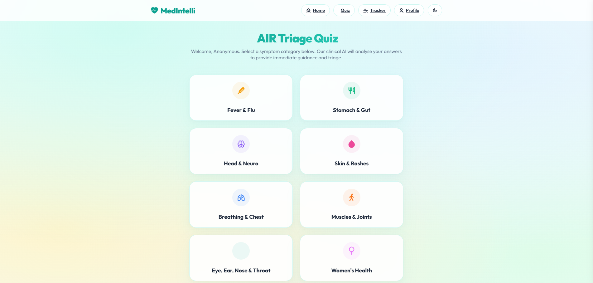 🖥️ Frontend: Vanilla JavaScript handles dynamic severity sliders, interactive SVG Body Map, and Web Speech API for voice-to-text 🔐 Auth & Database: Firebase (Authentication + Firestore) for secure login, Medical ID profiles, and persistent consultation history across devices 📊 Performance & Analytics: Firebase Analytics and Performance monitoring for fast load times — especially critical when users are stressed and need rapid answers 🚧 Challenges We Ran Into 🗂️ Structuring AI input — pairing free-text symptoms with quantitative data (pain scale 1–10, SVG body coordinates) required careful prompt parsing 🔄 Session management — preventing race conditions when fetching Medical ID from Firestore required robust async auth listeners and loading states 🛡️ AI guardrails — ensuring the AI never confidently gives definitive diagnoses, but always offers safe triage and responsible guidance 🏆 Accomplishments We're Proud Of ✨ A premium UI/UX that feels polished and professional 🎙️ Native voice input + interactive Body Map = a far more accessible experience, especially for elderly users 🚨 The Emergency SOS Module — we recognized that relying on an AI during an active heart attack is dangerous, so we built a dedicated hard-coded module that delivers pure visual first-aid in one click 📚 What We Learned 🏗️ Building complex, stateful apps without heavy frameworks 🔥 Deep Firebase integration — real-time data persistence and secure Firestore rules 🧬 Clinical Prompt Engineering — how to make AI act conservatively and safely when handling human health data 🚀 What's Next for MedIntelli 📸 Multimodal AI Vision — upload a photo of a rash, wound, or swelling for AI visual analysis alongside symptoms 👨⚕️ Doctor Portal — generate a secure PDF or encrypted link of your Symptom Tracker to send directly to your healthcare provider 📱 Native iOS/Android App — bringing Emergency SOS guides fully offline for when you need them most ⚠️ MedIntelli is an AI-assisted triage tool and does not replace professional medical advice. Always consult a qualified healthcare provider for diagnosis and treatment.