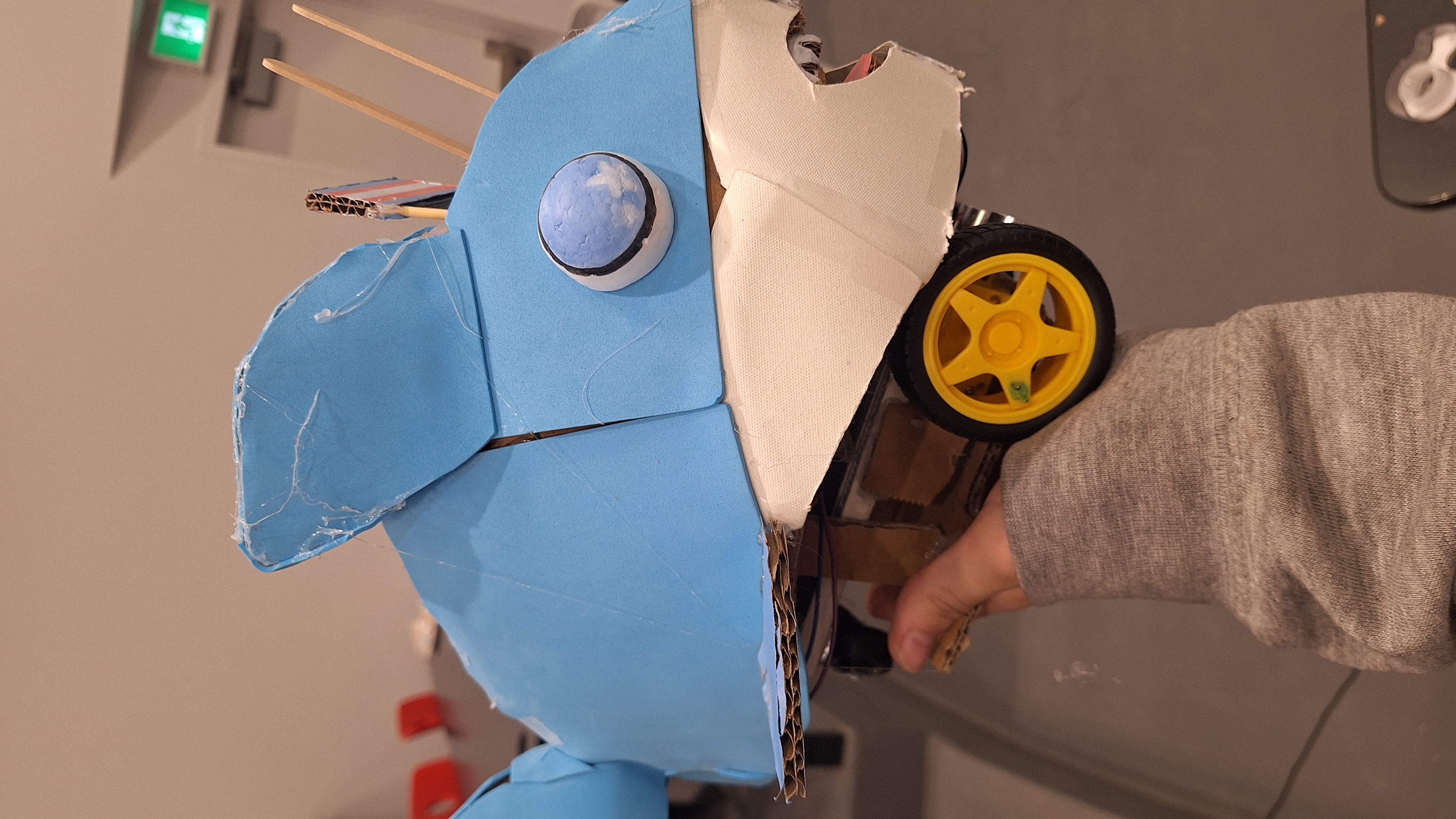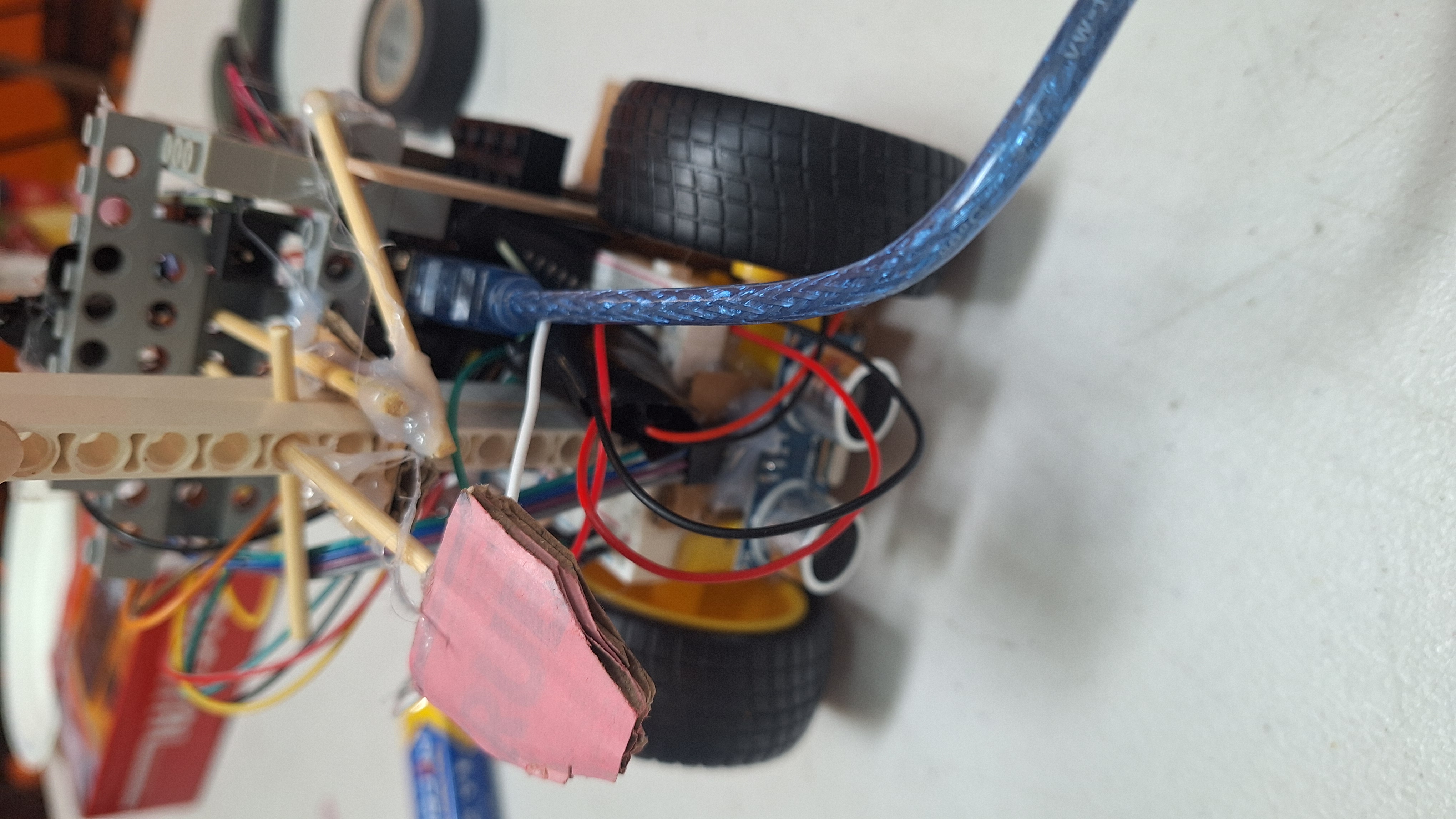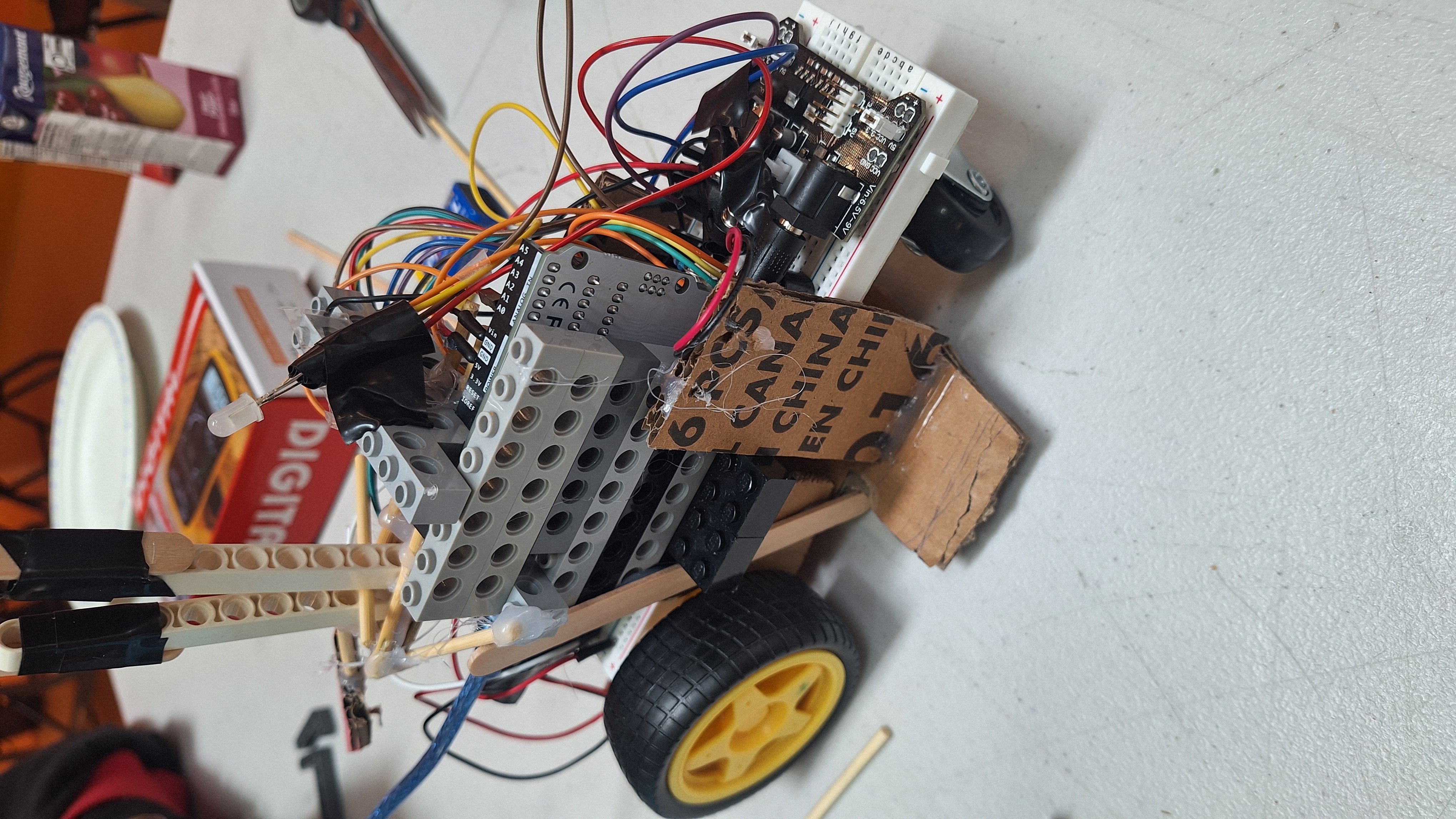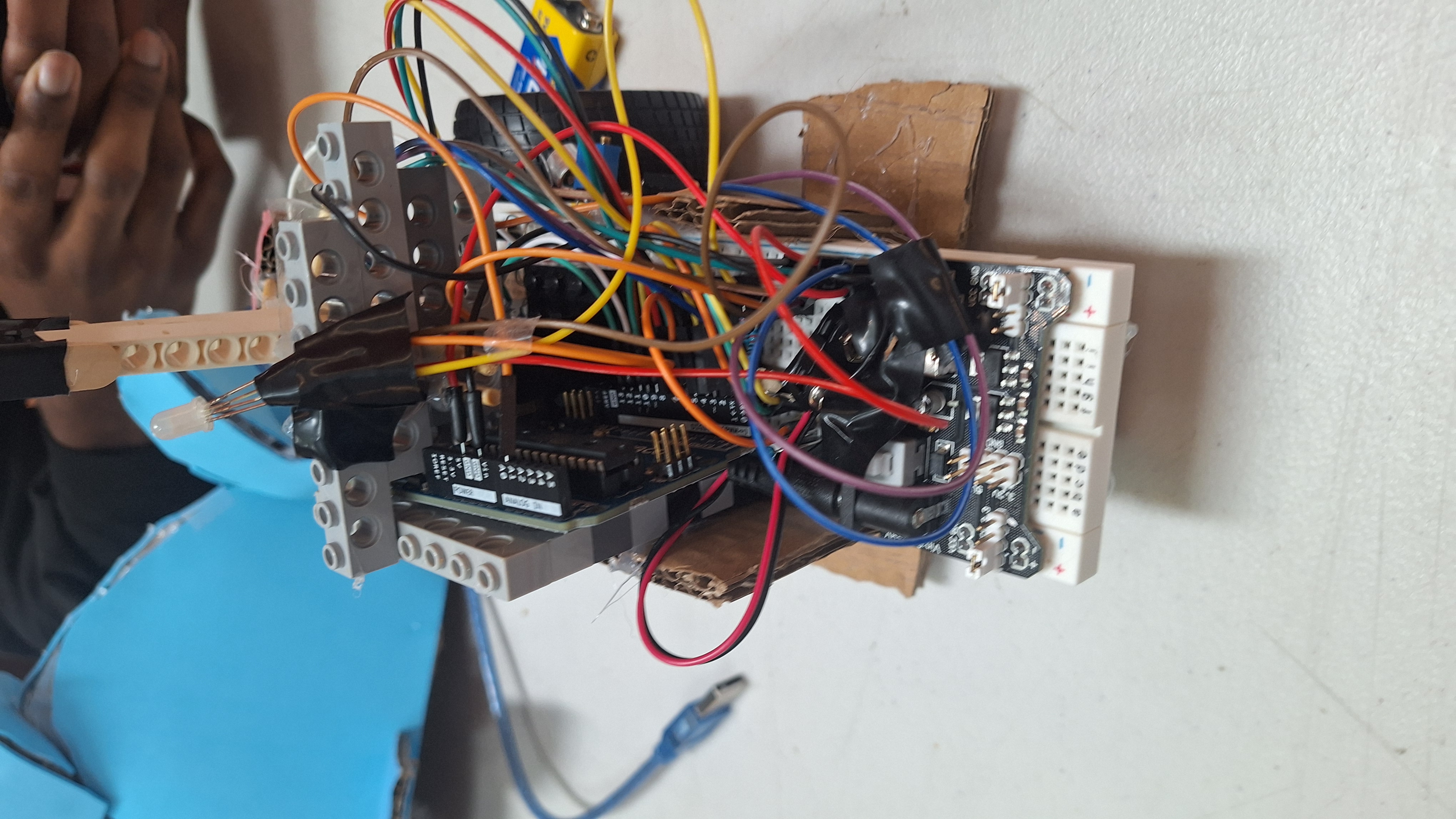 2 moteurs pour gérer les roues pour le mouvement; détecteur de rythme cardiaque (bouton) pour la détection; bouton pour changer de mode quand personne trouvée capteur ultrason pour éviter les obstacles
