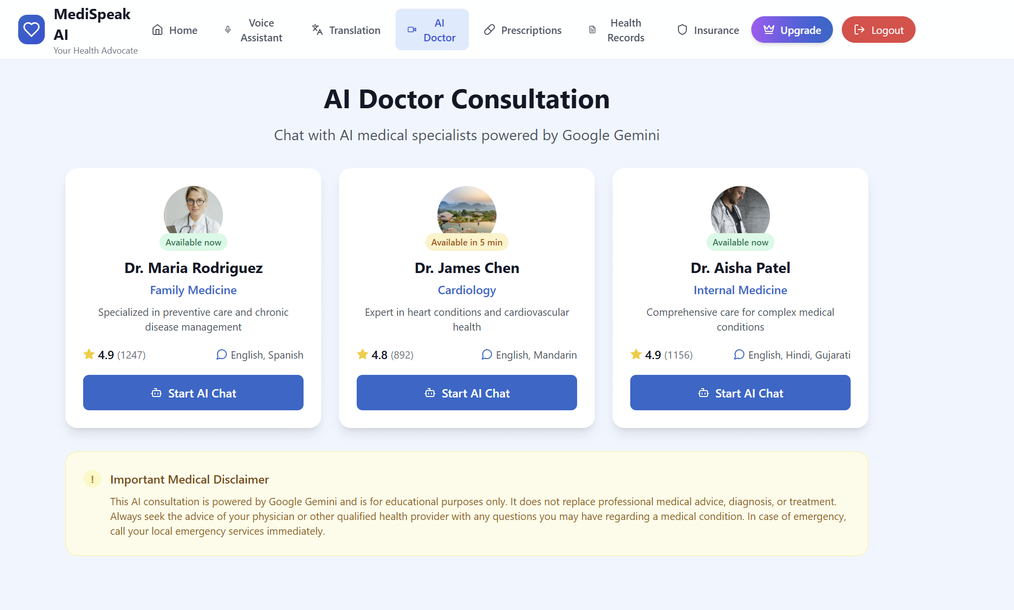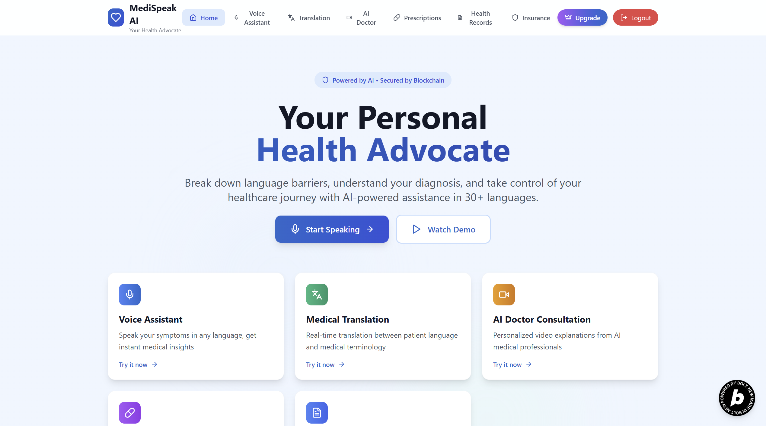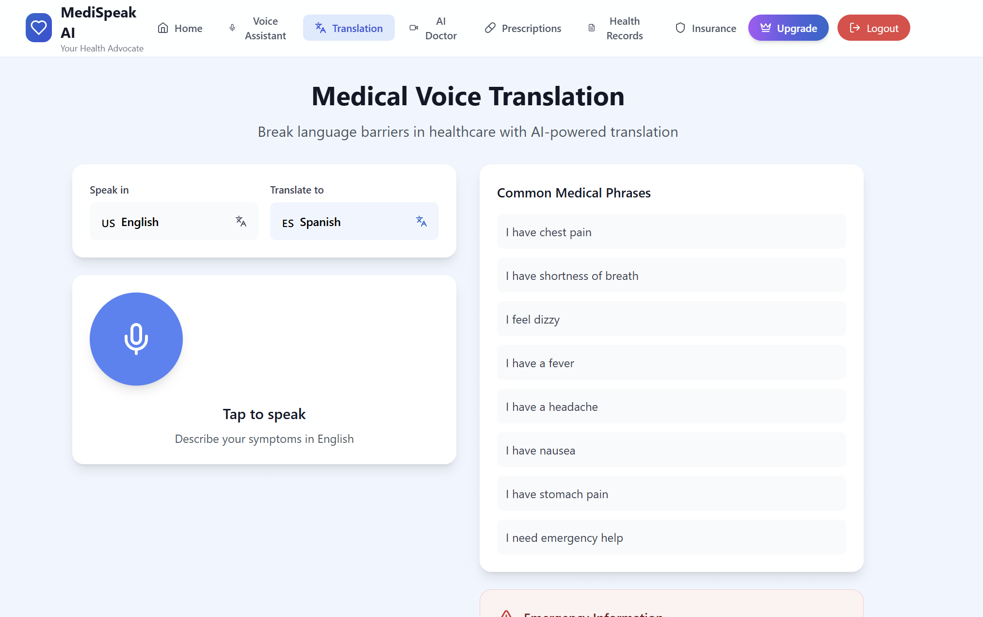 MediSpeak AI is the world's first voice-powered health advocate that speaks every language. Our platform combines cutting-edge AI technologies to create a complete healthcare communication solution: