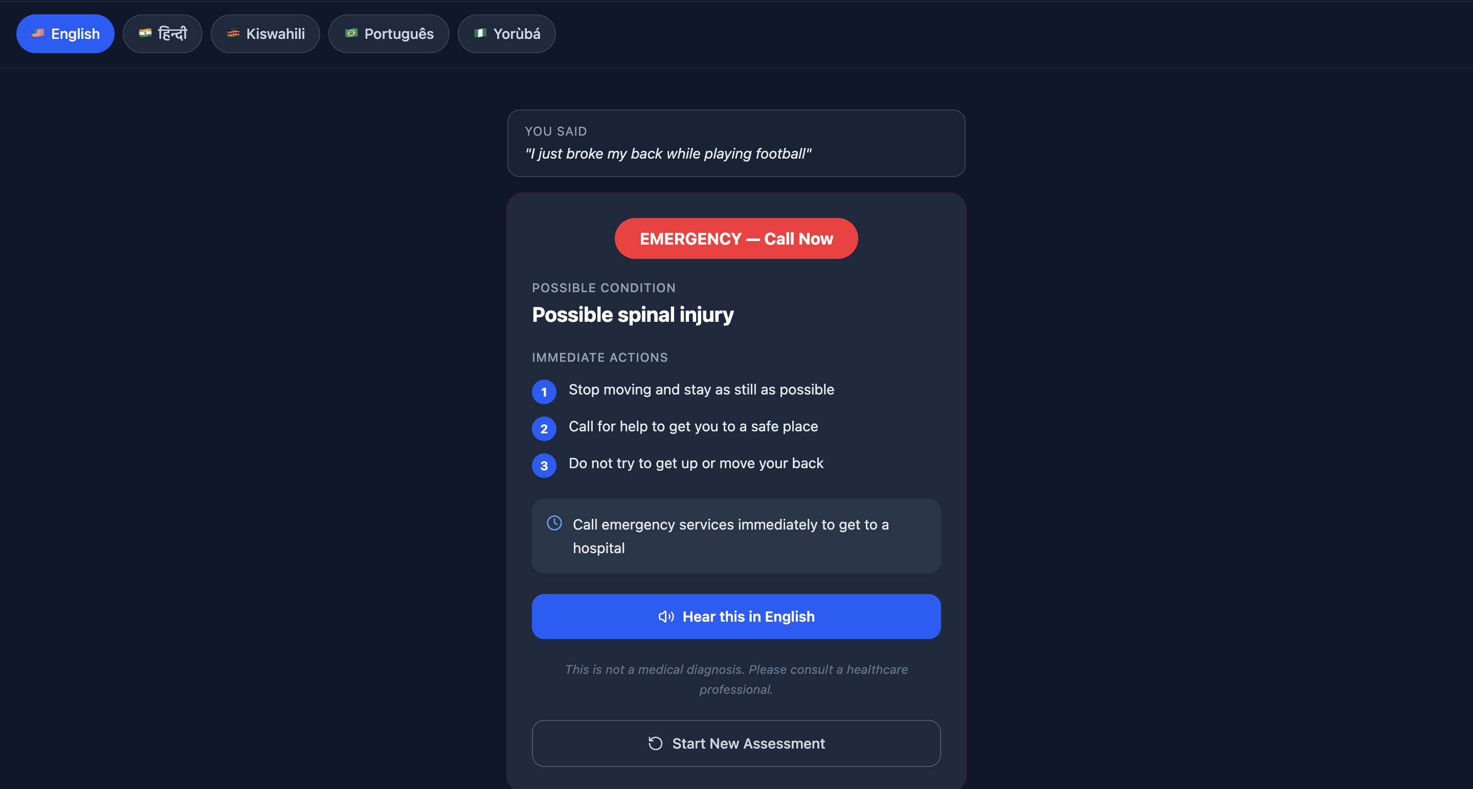 Select their language (Yoruba, Hindi, Swahili, Portuguese, or English) Tap a microphone button and speak their symptoms Receive a structured response including: Severity level (low, moderate, urgent, emergency) Likely condition 3–4 recommended next steps