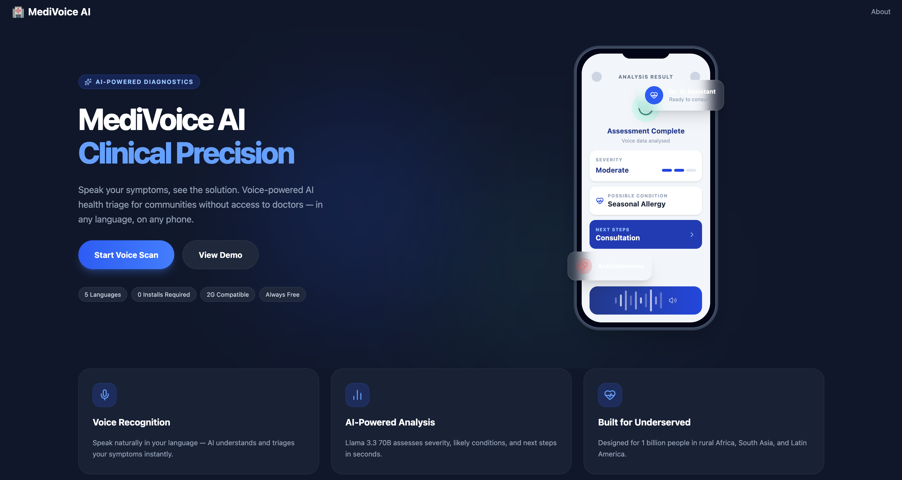 MediVoice AI is a voice-first, multilingual health triage web app that allows users to describe their symptoms naturally and receive instant AI-powered guidance.