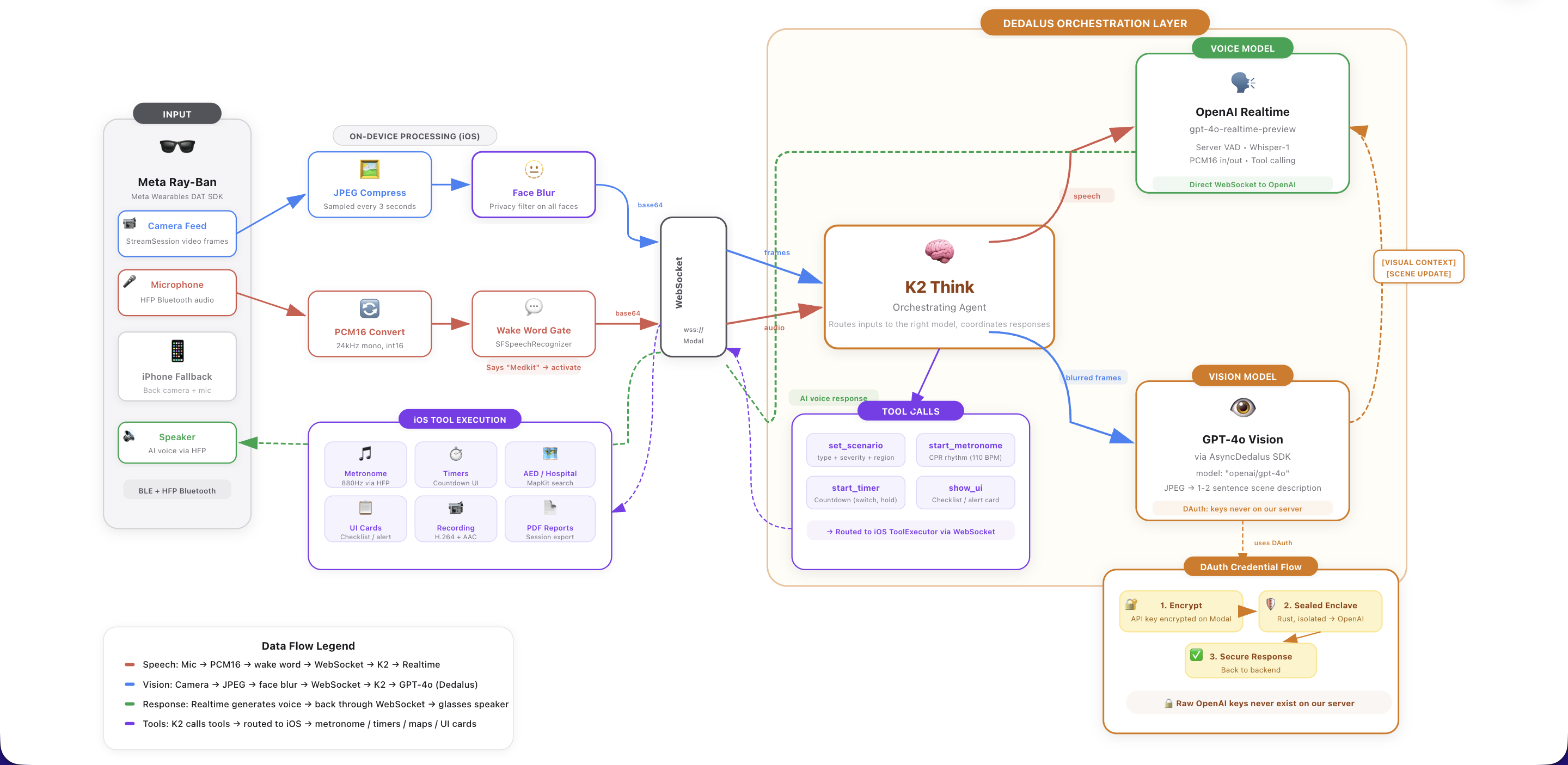 - iOS → Realtime: Streams audio and video frames from the glasses to OpenAI's Realtime API