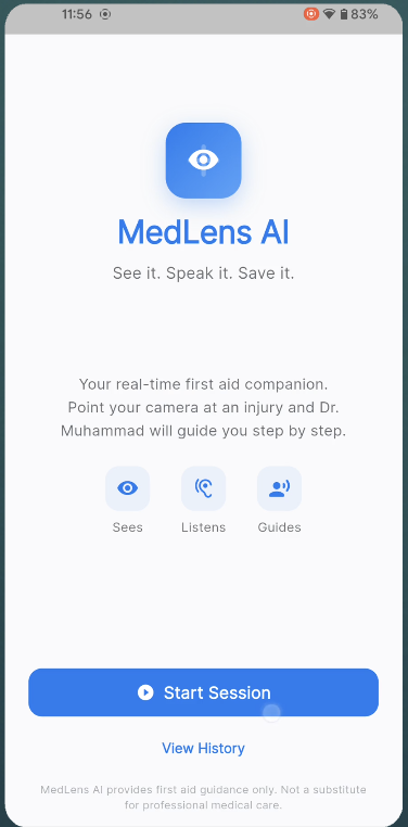MedLens AI is a mobile app with one job: real-time first aid guidance through voice and vision.