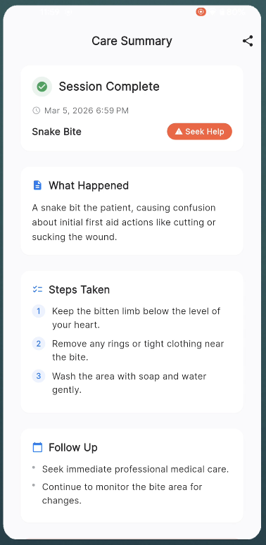 The care summary generation is solid. At session end, the full transcript goes to Gemini Flash, which produces structured JSON with injury type, severity, steps taken, warning signs, and follow-up recommendations. A 12-second timeout with a fallback ensures it never hangs.