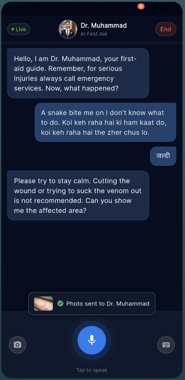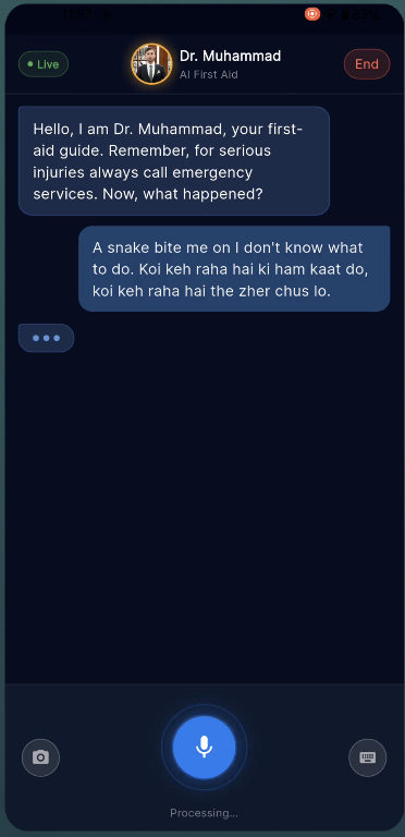 My co-builder on this project, Dr. Muhammad Khan, is an actual doctor. We've had this conversation dozens of times: "If people just had someone calm telling them what to do in the first 5 minutes, half these cases wouldn't get worse." The problem is that in an emergency, nobody can type. Your hands are shaking, or they're busy applying pressure, or you're holding a crying kid. Text-based chatbots are useless when you're panicking.