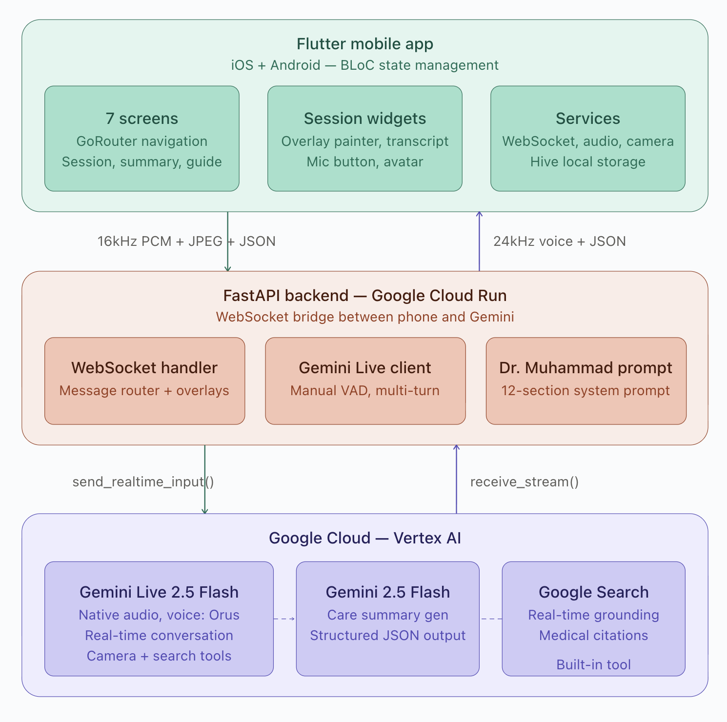 The hardest architectural decision was the audio pipeline. Gemini Live uses a persistent WebSocket with bidirectional streaming — the phone records 16kHz PCM from the microphone, streams it to our Cloud Run backend, which bridges it to Gemini. Gemini sends back 24kHz PCM audio that the phone plays. All of this happens with low enough latency that it feels like a phone call.