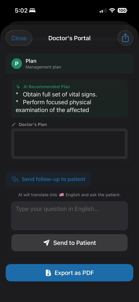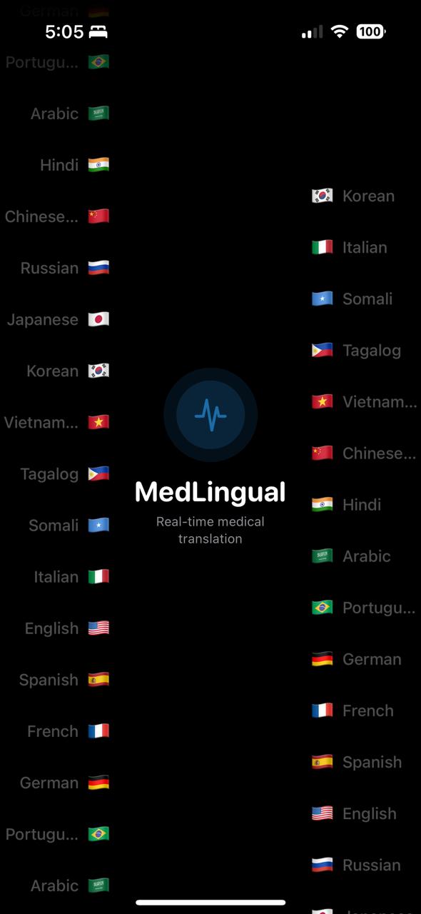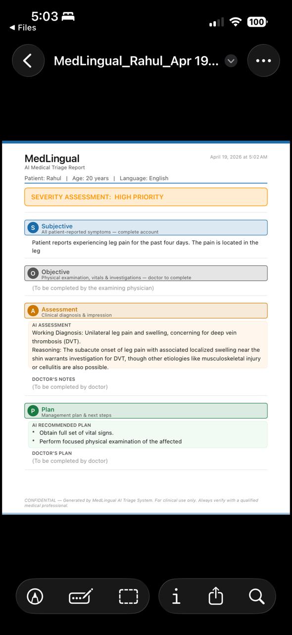 MedLingual is an iOS app that sits in a doctor's pocket and eliminates the language barrier during medical triage. The doctor creates a patient session, selects the patient's language, and hands their phone across the desk. The patient speaks in their language — Bengali, Tamil, Spanish, Hindi, Arabic, or any of the 17 supported languages. MedLingual listens, translates, and asks smart medical follow-up questions back in the patient's language. On the doctor's side of the screen, a structured SOAP note builds itself in real time in English — the standard clinical format every doctor already uses. If the patient mentions chest pain, difficulty breathing, or any life-threatening symptom, an urgent alarm shows instantly. When the session is done, the doctor verifies the note, signs it, and exports a PDF ready for any EHR system.