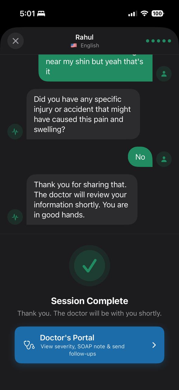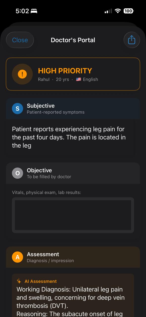 The triage flow translates the patient's spoken transcript into their language for display, then generates up to 5 AI-driven clinical follow-up questions. Once the session ends, the Doctor's Portal triggers four parallel async Gemini calls — subjective summary, assessment, plan, and urgency classification — all forced to English output regardless of patient language.