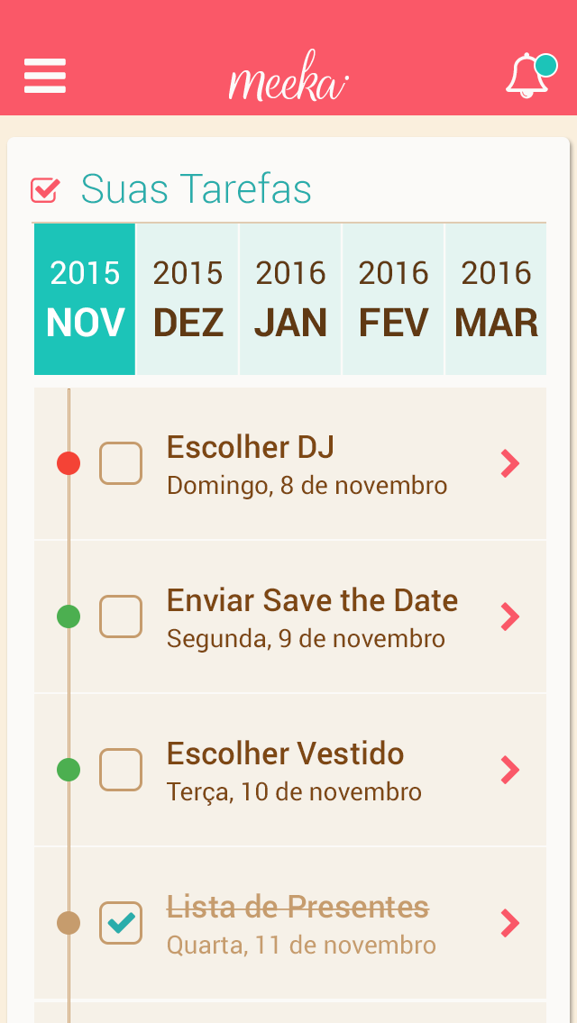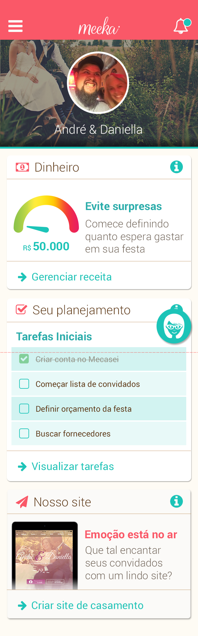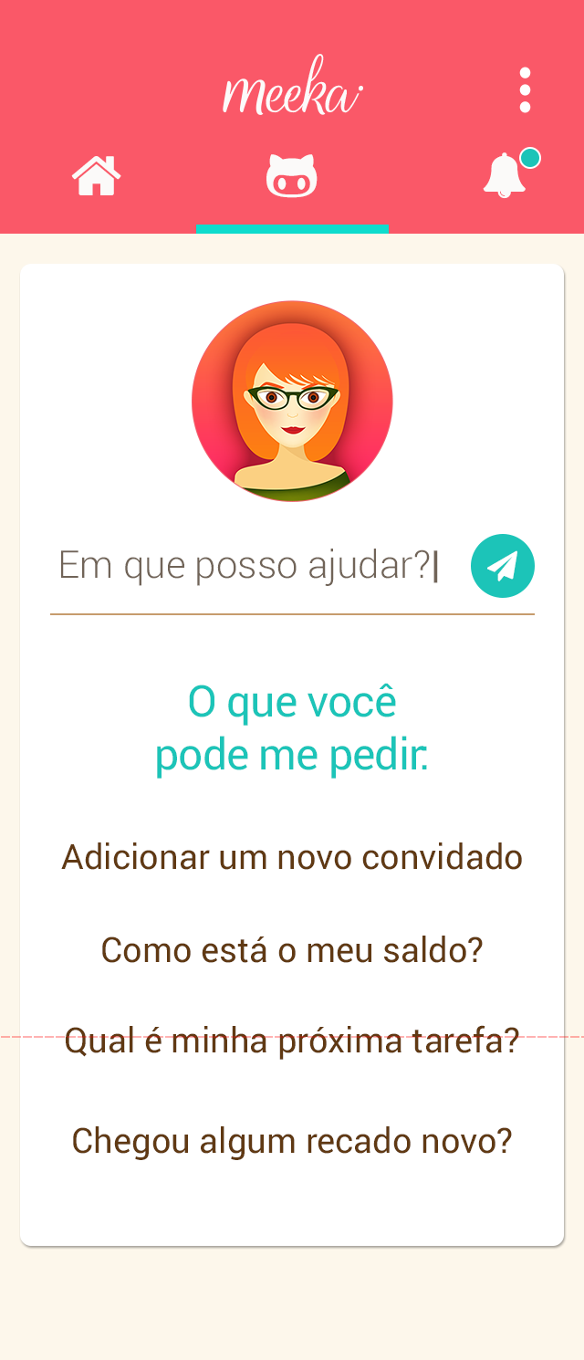 A recent survey by Nuance, a company specializing in human-robot iteration, reveals that 71% of women give name for your virtual personal assistants. The Meeka born from the need of the bride and groom to have the dream wedding and count with a big shoulder to all times and Mecasei.com to take your business for the day-to-day engaged in the most widely used communication model today. Knowing that the experience in mobile is short and objective readings, focused on action. According to the stage of every bride, and profile them based on historical data and intelligent questions based on machine learning, Meeka is at all times: the marriage proposal, through the altar and beyond. Anticipating events (predictive analysis) and suggesting actionable insights to Meeka follows the company's vision to become the best friend of the grooms.