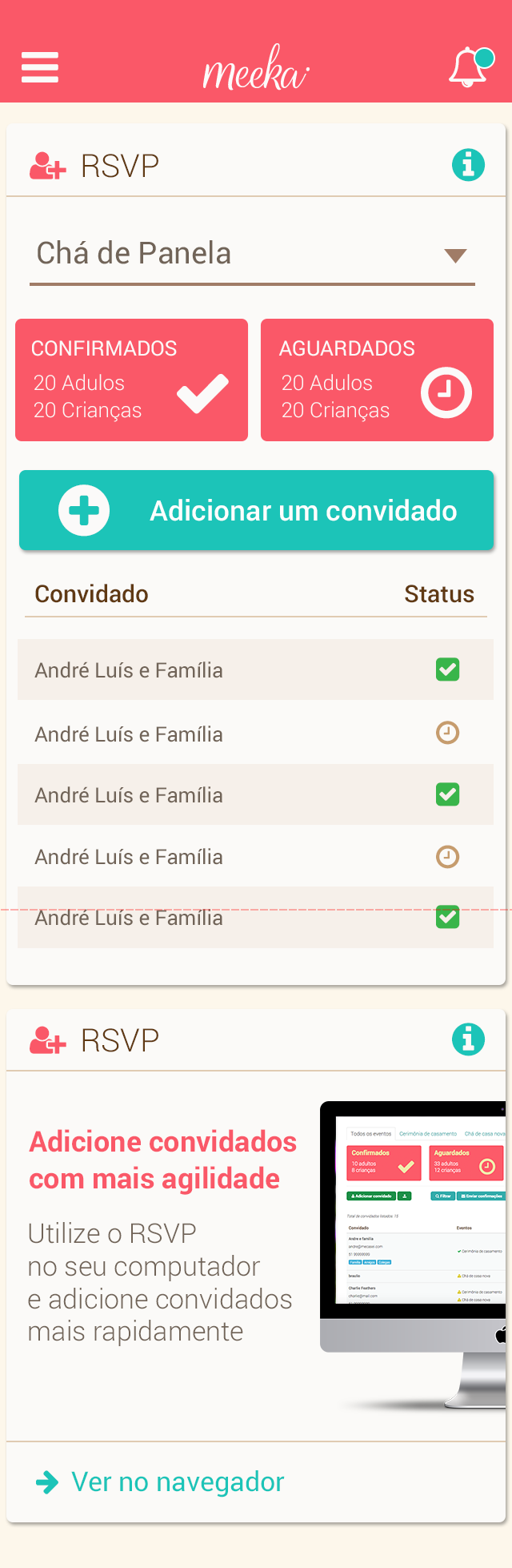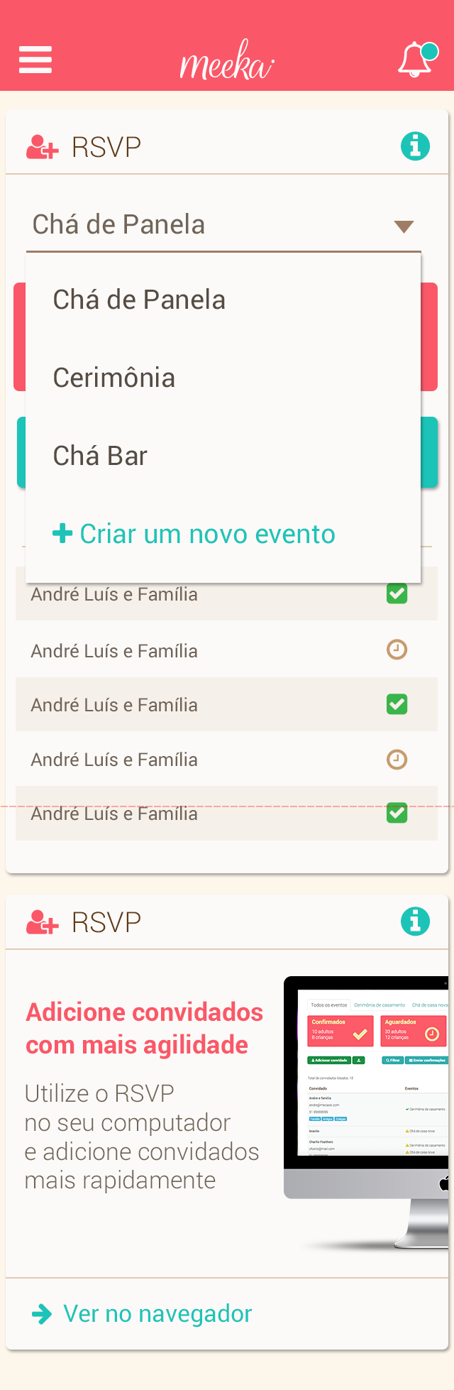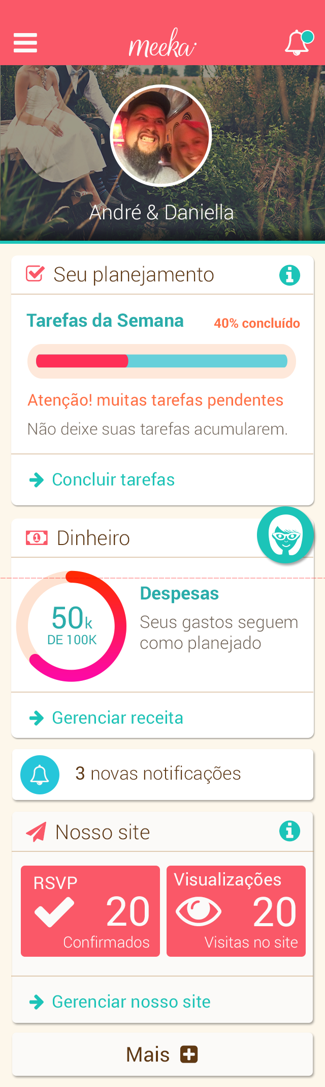 A recent survey by Nuance, a company specializing in human-robot iteration, reveals that 71% of women give name for your virtual personal assistants. The Meeka born from the need of the bride and groom to have the dream wedding and count with a big shoulder to all times and Mecasei.com to take your business for the day-to-day engaged in the most widely used communication model today. Knowing that the experience in mobile is short and objective readings, focused on action. According to the stage of every bride, and profile them based on historical data and intelligent questions based on machine learning, Meeka is at all times: the marriage proposal, through the altar and beyond. Anticipating events (predictive analysis) and suggesting actionable insights to Meeka follows the company's vision to become the best friend of the grooms.