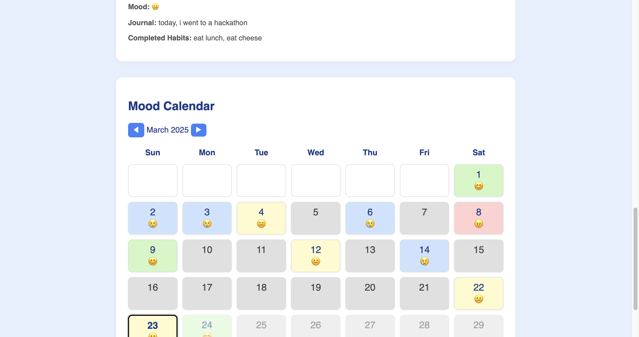 One of the main challenges we faced was ensuring the app was both intuitive and visually appealing. We wanted to strike the right balance between functionality and simplicity, which meant a lot of iterations on the design. Syncing the user's habits and moods with the calendar, as well as integrating real-time data, also took some time to perfect.