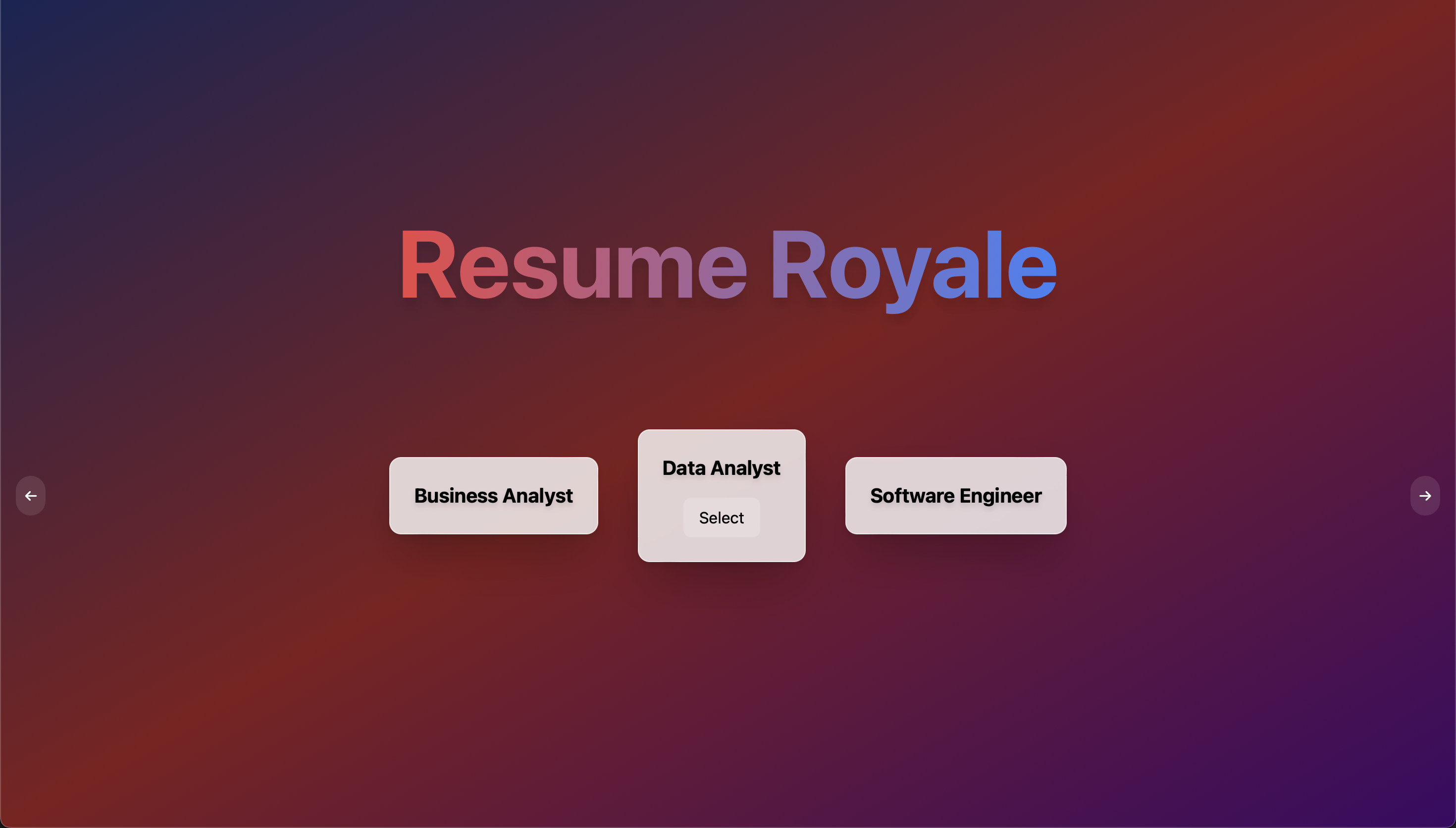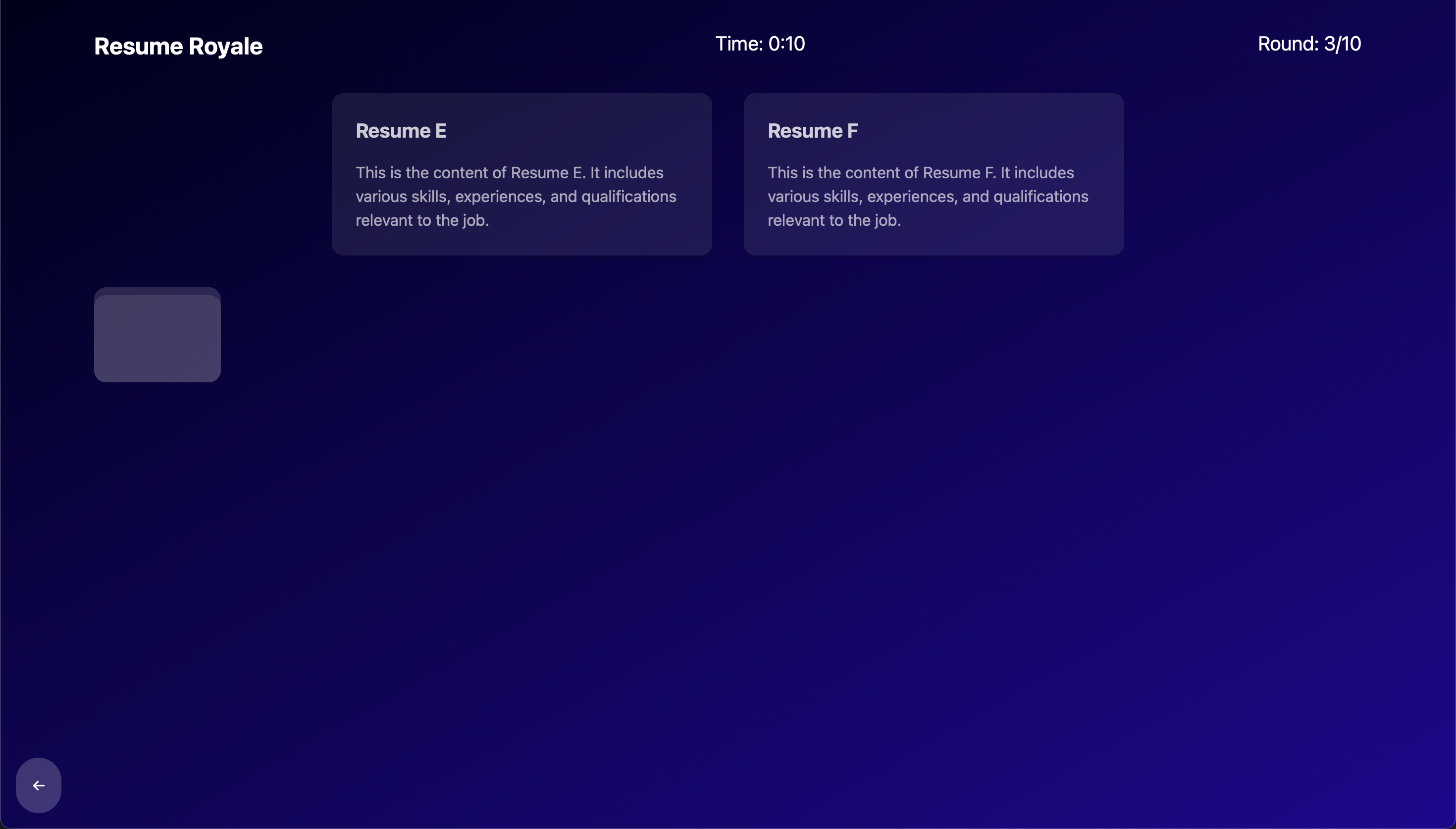 Resume Royale is a gamified training simulator designed to teach users how to assess resumes effectively. Players enter the simulator by selecting a job description. Two resumes then appear on screen, and players decide which one to keep and which one to discard. After completing the game, they receive feedback with a percentage score reflecting how many "correct" resumes they kept based on pre-defined metrics.