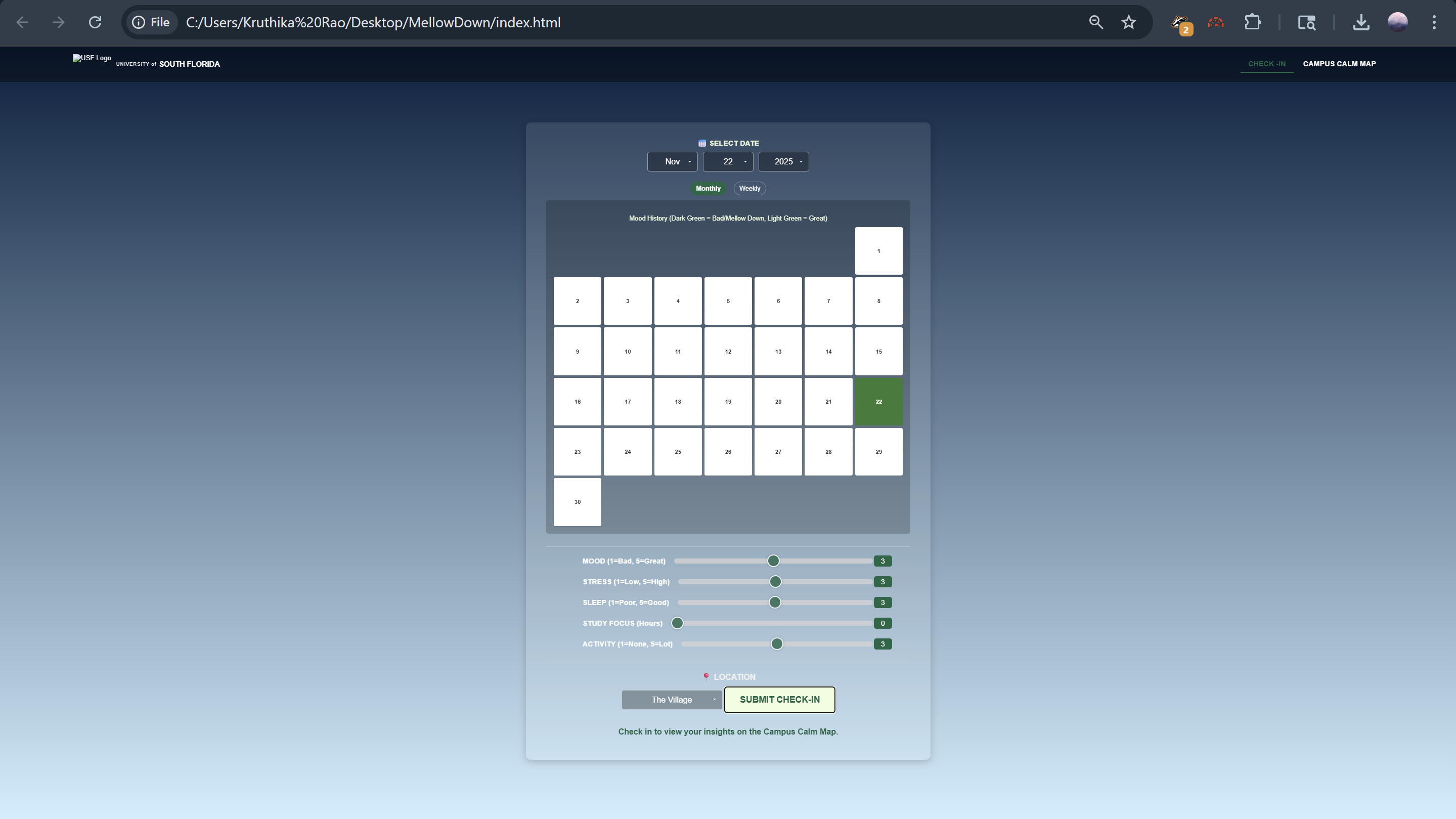 🌟 What it Does It features a Daily Check-In using sliders to log Mood, Stress, Sleep, etc. The input data is mapped to a color-coded history chart where a darker green color signals a crucial "Mellow Down" warning. The Campus Calm Map provides dynamic walking guidance to nearby calm spots on campus.
