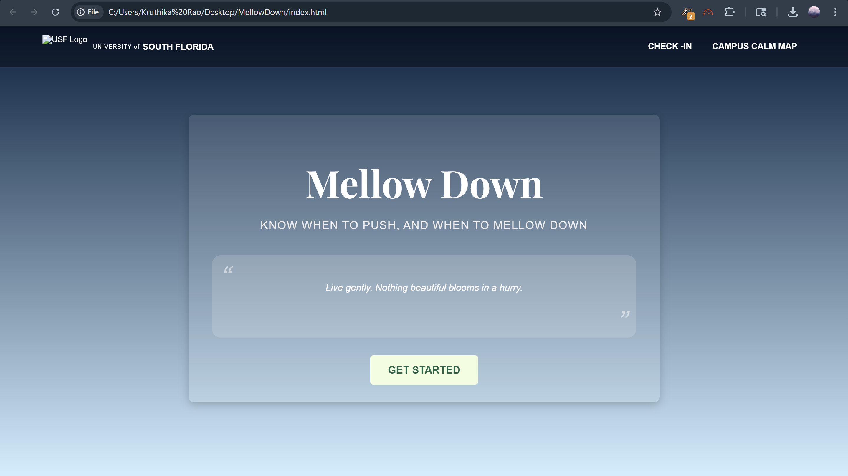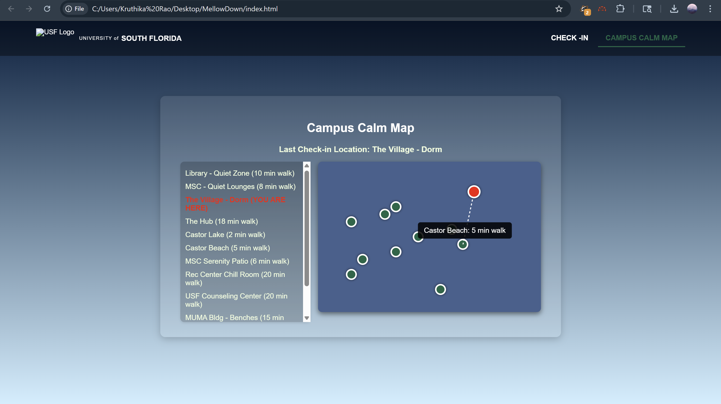 🚀 What's Next for Mellow Down Next, I plan to implement localStorage for data persistence across browser sessions. I will then develop a Smart Recommendation Engine to automatically suggest the best Calm Spot based on the latest check-in. Finally, I plan to integrate direct links to USF wellness resources.